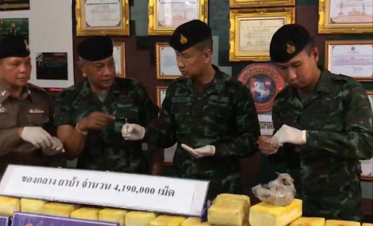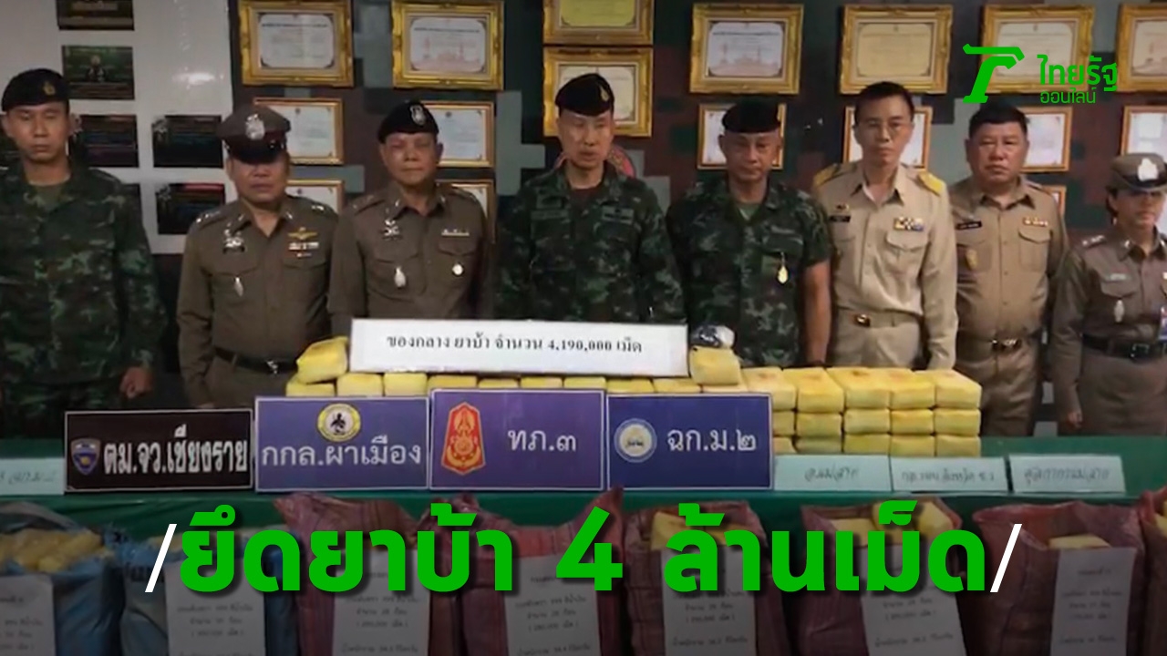 กองกำลังผาเมือง แถลงยึดยาบ้ากว่า 4 ล้านเม็ด ซุกกระสอบฟางวางกองรวมกันอยู่ภายในร่องน้ำข้างถนน พื้นที่บ้านเหมืองแดงใต้ อ.แม่สาย จ.เชียงราย ตรวจสอบเป็นของมาจากโรงงานผลิตของว้าใต้