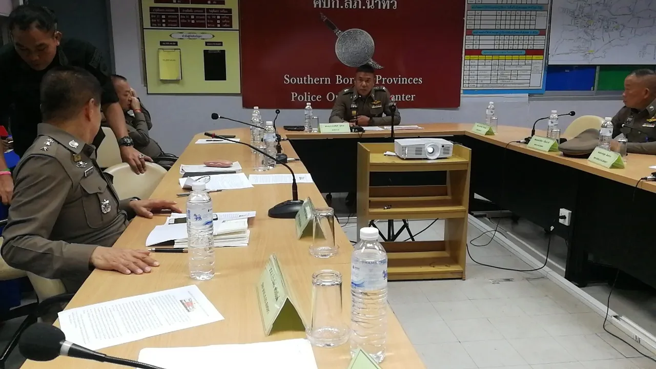 จากนั้นที่ สภ.นาทวี พล.ต.ท.รณศิลป์ ภู่สาระ ผบช.ภ.9 พร้อมดวยพล.ต.ต.โชติ ชัยชมภู รอง ผบช.ภ.9 พล.ต.ตปรีดา เปี่ยมวารี ผบก.ภ.จว.สงขลา พ.อ.หาญพล เพชรม่วง ผบ.ฉก.ทพ.43 พล.ต.ต.ปิยะวัฒน์ เฉลิมศรี ผบก.ภ.จว.ปัตตานี พ.ต.อ.ชุมพล ศักดิ์สุรีย์มงคล รอง ผบก.บก.สส.จชต. พ.ต.อ.เอกรัฐ สวนแสน ผกก.สภ.นาทวี เข้าร่วมประชุม