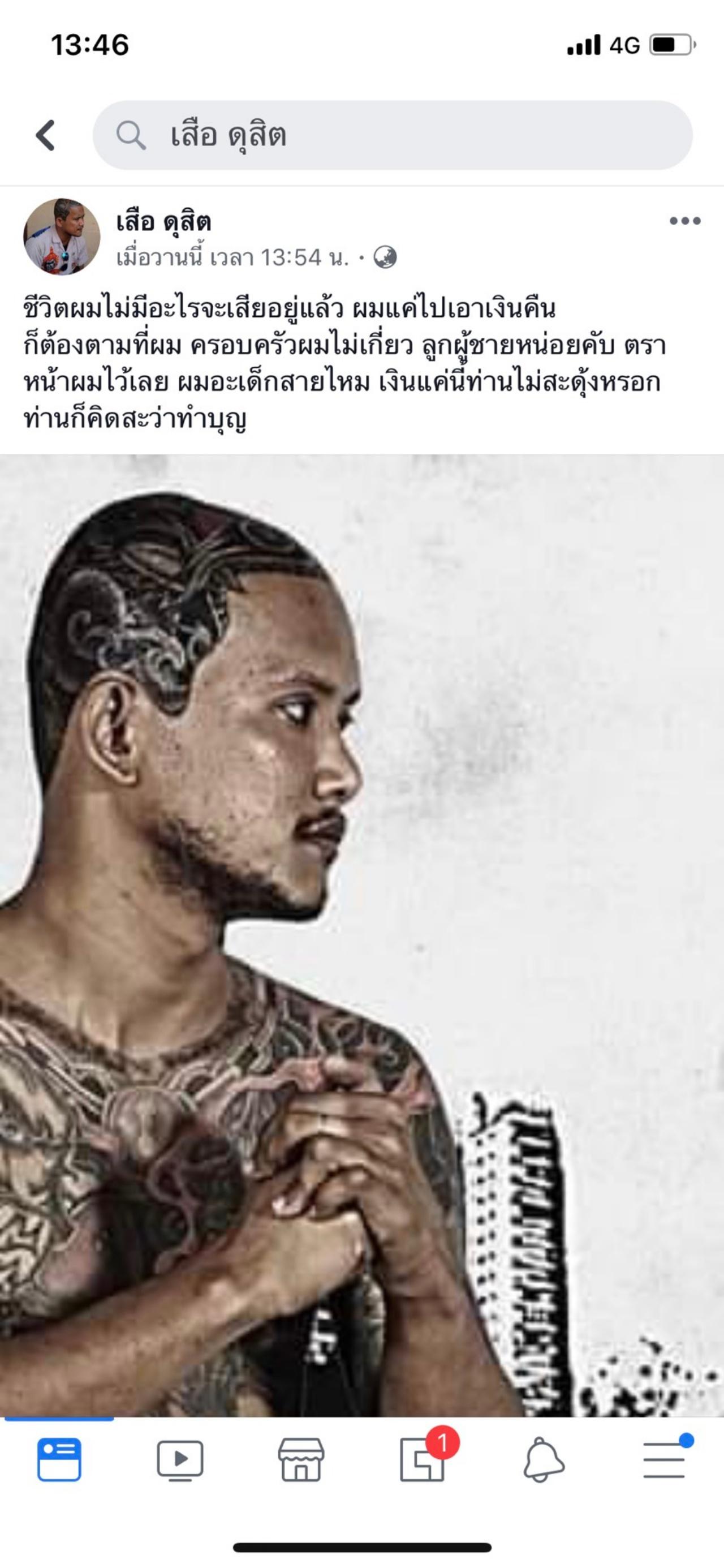 ทั้งนี้ เมื่อ 9 ชม.ที่ผ่านมา เฟซบุ๊กชื่อ เสือ ดุสิต ได้โพสต์ข้อความว่า ชีวิตผมไม่มีอะไรจะเสียแล้ว ผมแค่ไปเอาเงินคืนก็ต้องตามที่ผม ครอบครัวผมไม่เกี่ยว ตราหน้าผมไว้เลย ผมอะเด็กสายไหม เงินแค่นี้ท่านไม่สะดุ้งหรอก ท่านก็คิดซะว่าทำบุญ.