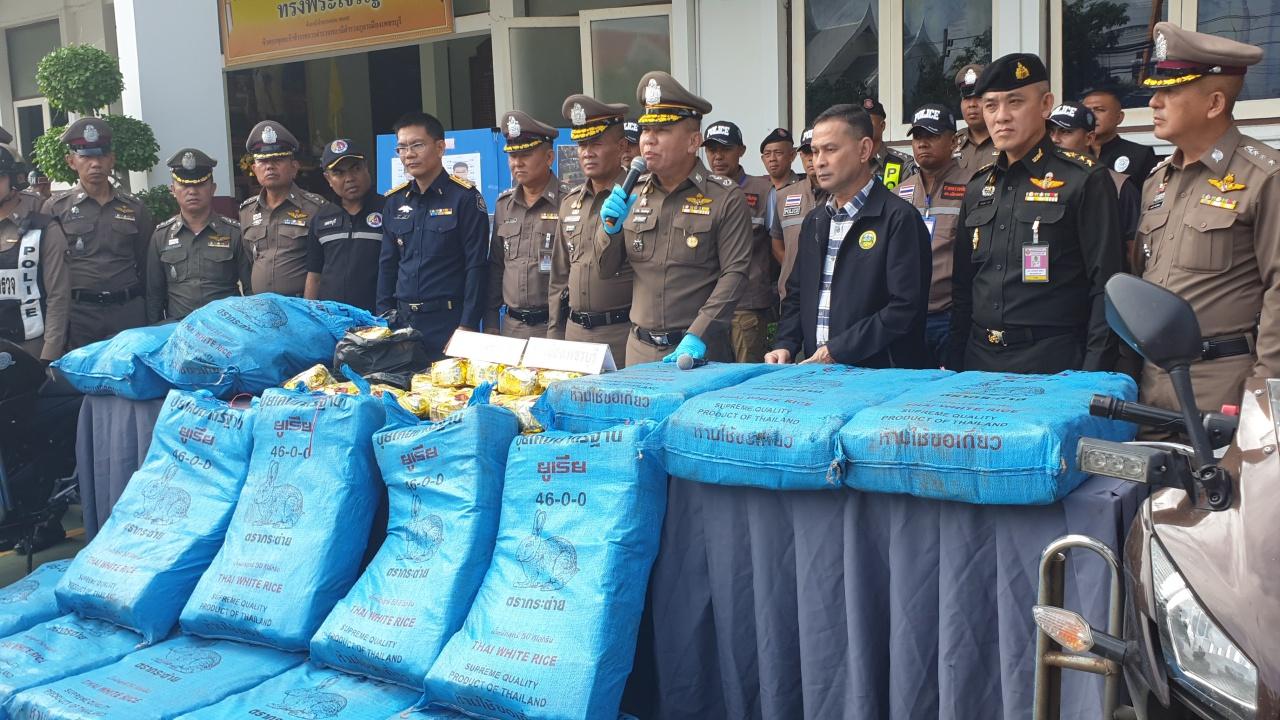 ตร.เพชรบุรี แถลงจับ 2 อา-หลานขนยาไอซ์กว่า 15 กระสอบ จำนวน 467 กก. มูลค่าราว 235 ล้านบาท ส่งภาคใต้ แต่ดวงซวยรถสิบล้อที่ขับมาเกิดคว่ำ ทำยาไอซ์ตกเกลื่อนถนน บริเวณทางลอดใต้สะพานยกระดับเข้าเมืองเพชรบุรี