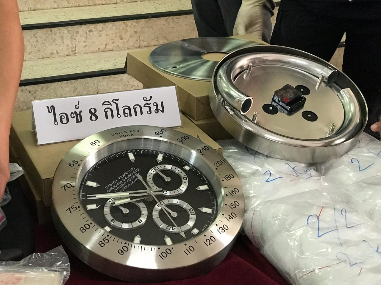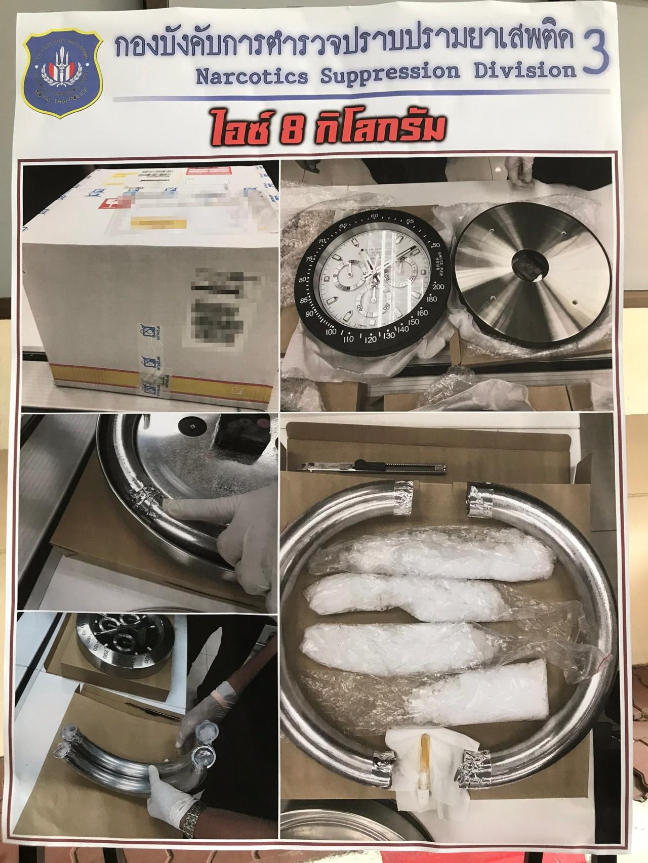 พล.ต.ต.วัชระ กล่าวว่า คดีนี้เจ้าหน้าที่ชุดตรวจยึดได้รับแจ้งว่า จะมีการลักลอบส่งยาเสพติดออกนอกประเทศทางพัสดุภัณฑ์ ผ่านบริษัทเอกชนรับส่งพัสดุระหว่างประเทศแห่งหนึ่ง จึงได้ร่วมกันตรวจสอบพัสดุต้องสงสัยจากประเทศไทยปลายทางประเทศญี่ปุ่น จำนวน 2 รายการ สำแดงสินค้าที่ฝากส่งประเภทนาฬิกาแขวนผนัง แต่กลับพบว่ามีน้ำหนักมากผิดปกติ ซึ่งจากการตรวจสอบนาฬิกาแขวนผนังดังกล่าวโดยละเอียดพบว่าบริเวณกรอบนาฬิกามีท่อเหล็กซึ่งถูกดัดแปลงขึ้นภายในบรรจุยาเสพติด ประเภทเมทแอมเฟตามีน หรือไอซ์ น้ำหนักรวมประมาณ 8 กิโลกรัม อยู่ภายในจึงทำการตรวจยึดไว้เป็นหลักฐาน
