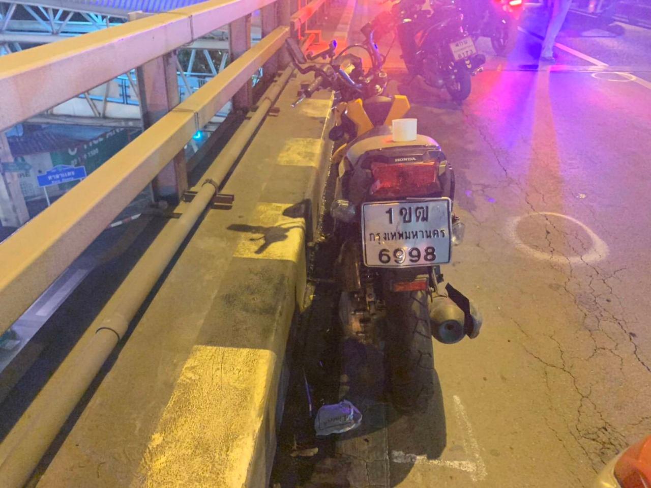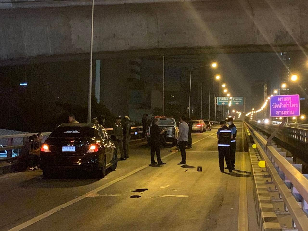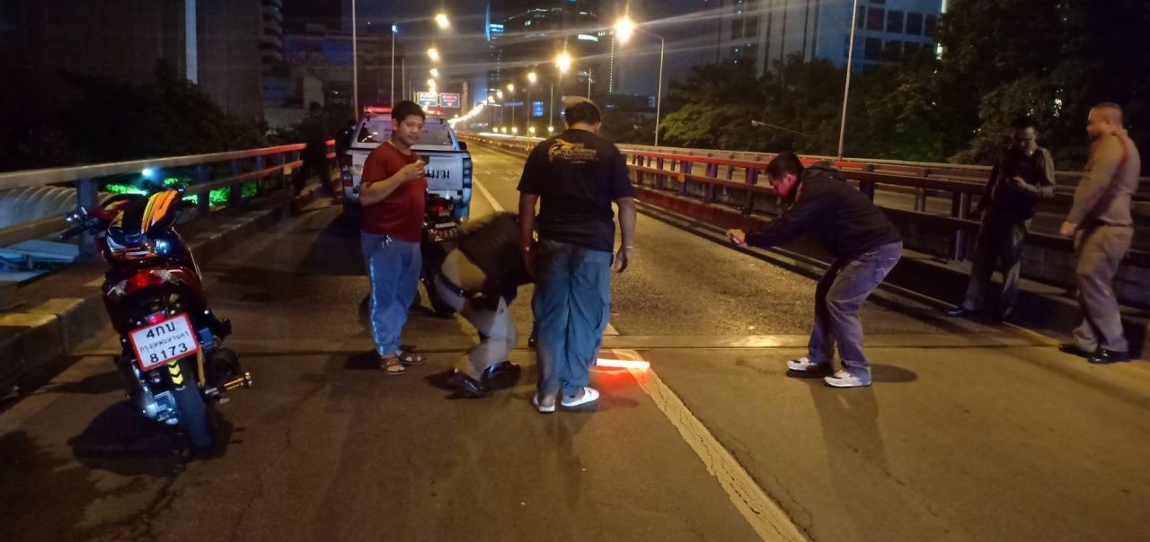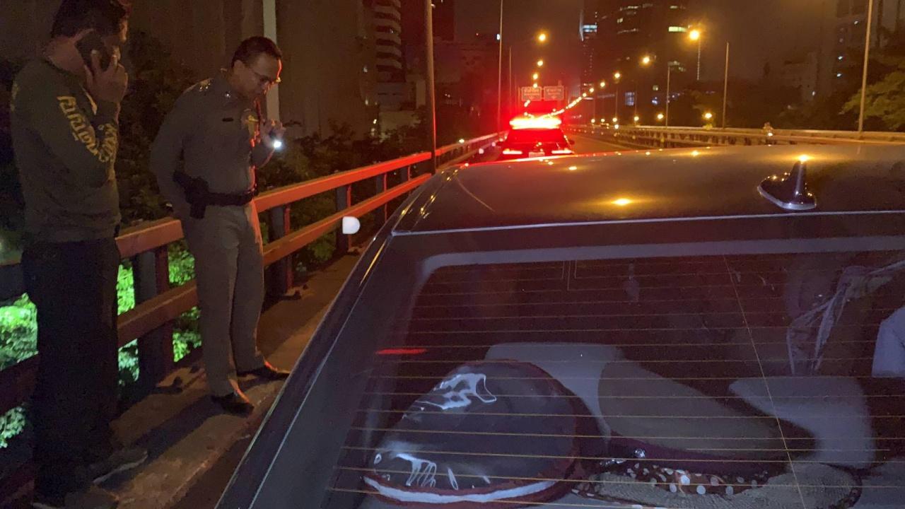 เมื่อเวลา 01.00 น. วันที่ 19 พ.ย.62 ร.ต.อ.เฉลิมพันธ์ ภูสมหมาย รอง สว.(สอบสวน) สน.ทุ่งมหาเมฆ รับแจ้งอุบัติเหตุรถชนมีการยิงปืนข่มขู่บริเวณบนสะพานไทย-ญี่ปุ่น ฝั่งขาเข้า มุ่งหน้าโรงแรมดุสิตธานี แขวงลุมพินี เขตปทุมวัน กรุงเทพฯ จึงประสานเจ้าหน้าที่กองพิสูจน์หลักฐาน และเจ้าหน้าที่มูลนิธิร่วมกตัญญูเข้าตรวจสอบ