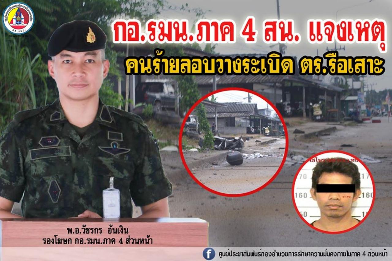 กอ.รมน.ภาค 4 สน.แถลงเหตุลอบวางระเบิดที่ อ.รือเสาะ มี จนท.บาดเจ็บ 3 นาย พบคนร้ายใช้ระเบิดแสวงเครื่อง คาดว่าคนร้ายที่ก่อเหตุน่าจะเป็นกลุ่มของ นายซุลกิฟลี มะสาแมง โดยเร่งตามตัวมาดำเนินคดีต่อไป