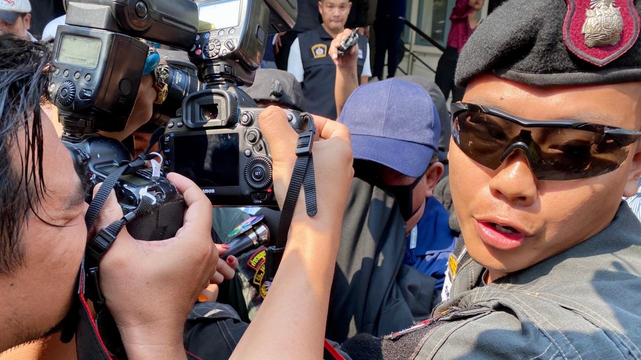 โดยในวันนี้กำลังตำรวจชุดสืบสวนและหน่วยปฏิบัติการพิเศษอาวุธครบมือได้คุมตัวผู้ต้องหาทั้ง 2 รายมายังห้องประชุม บช.ภ.1 ท่ามกลางบรรดาสื่อมวลชนหลายสำนักให้ความสนใจรอทำข่าวกันเป็นจำนวนมาก