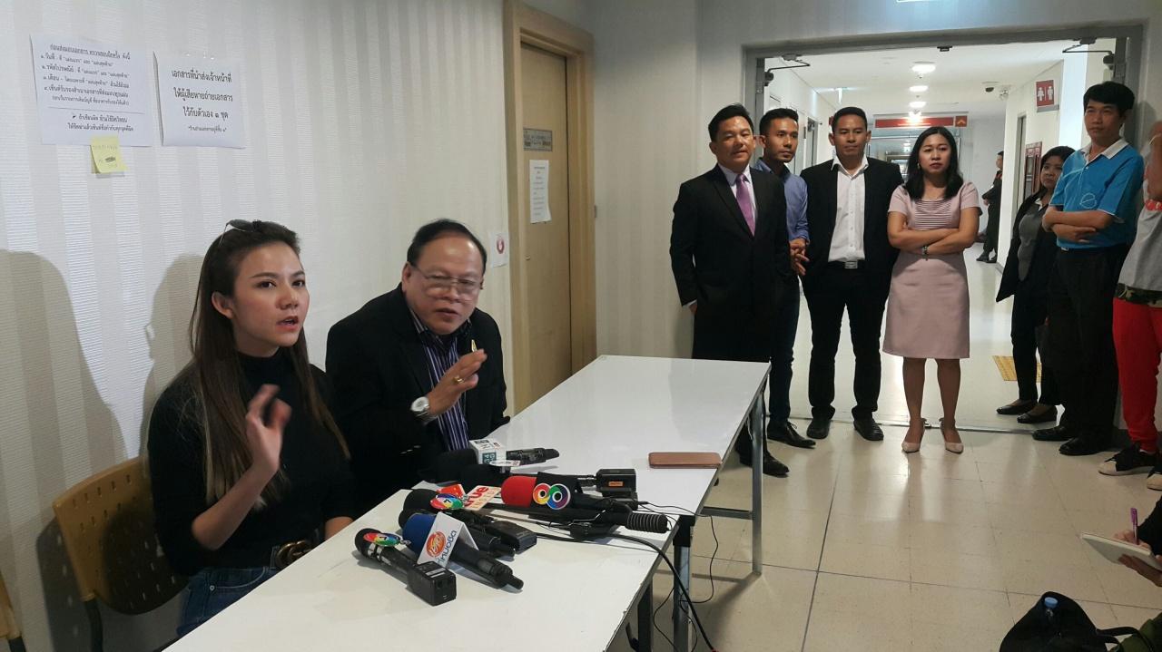 จากนั้น น.ส.นงผณี พร้อมนายมนตรี บานเย็น ทนายความ ออกมาแถลงข่าวหน้าห้องพนักงานสอบสวน