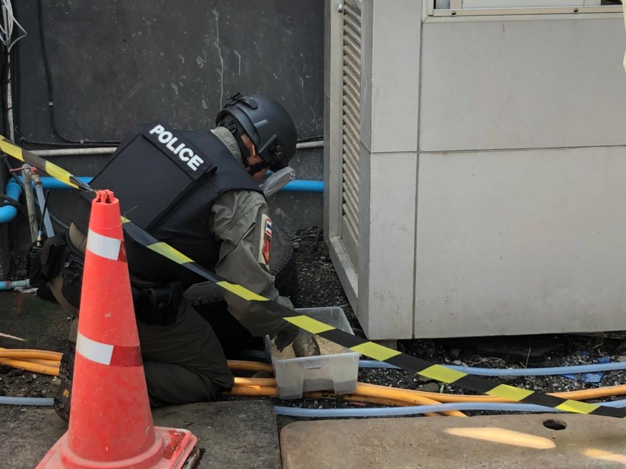 เมื่อไปถึงที่เกิดเหตุพบว่าเป็นไซต์งานปลูกสร้างคอนโดหรู เจ้าหน้าที่เข้าตรวจสอบบริเวณข้างป้อมยามหน้าทางเข้าไซต์งานพบเป็นหัวของวัตถุระเบิดอยู่ในสภาพสนิมเขรอะ และมีเศษดินโคลน จึงนำยางรถยนต์มาครอบไว้พร้อมกับนำโปลิสไลน์มาปิดกั้นไม่ให้ผู้ไม่มีส่วนเกี่ยวข้องเข้าไปใกล้กับจุดเกิดเหตุ