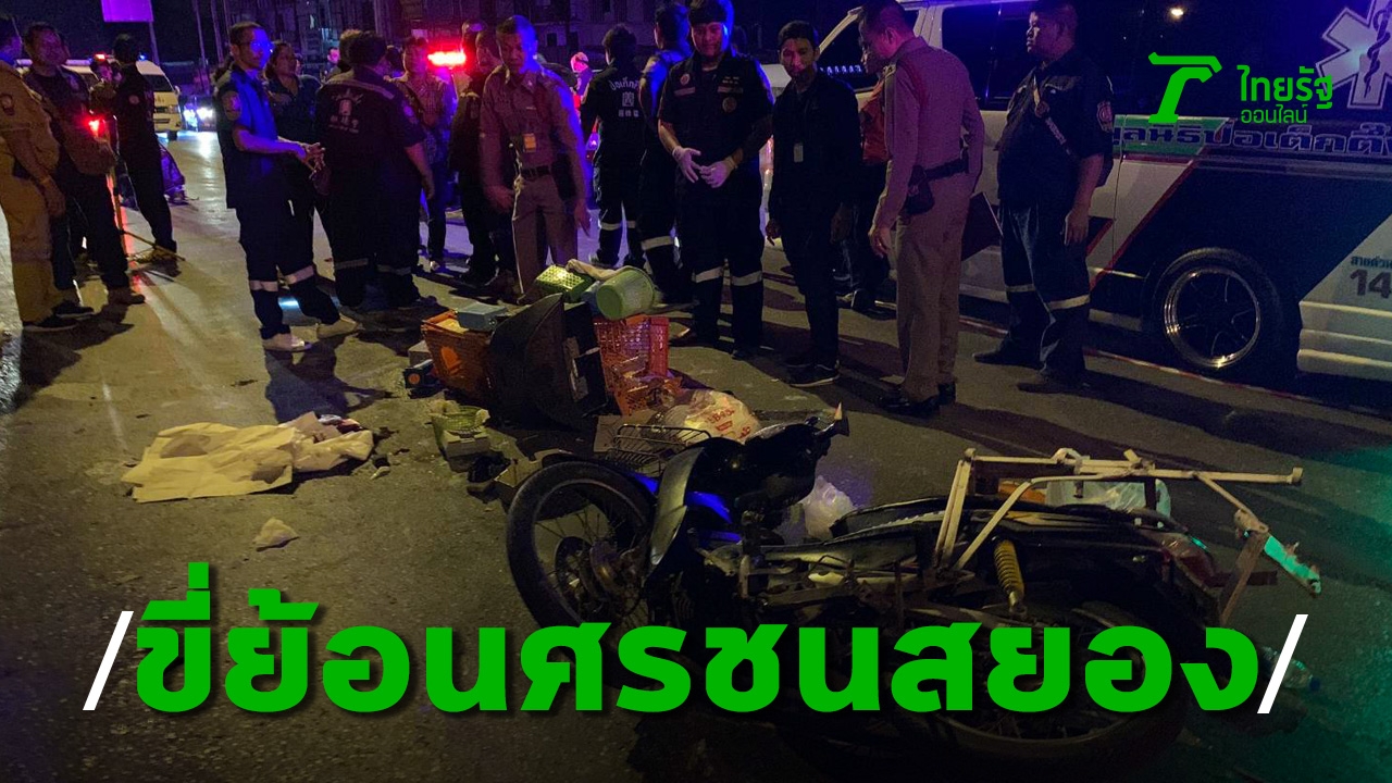อุบัติเหตุบนถนนสรงประภา มุ่งหน้าใกล้แยกศรีสมาน เขตดอนเมือง พ่อค้ายำกุ้งเต้นขี่จยย.ย้อนศร พุ่งชนประสานงาจยย.พนักงานเคอรี่ เสียชีวิตคาที่ 2 ศพ