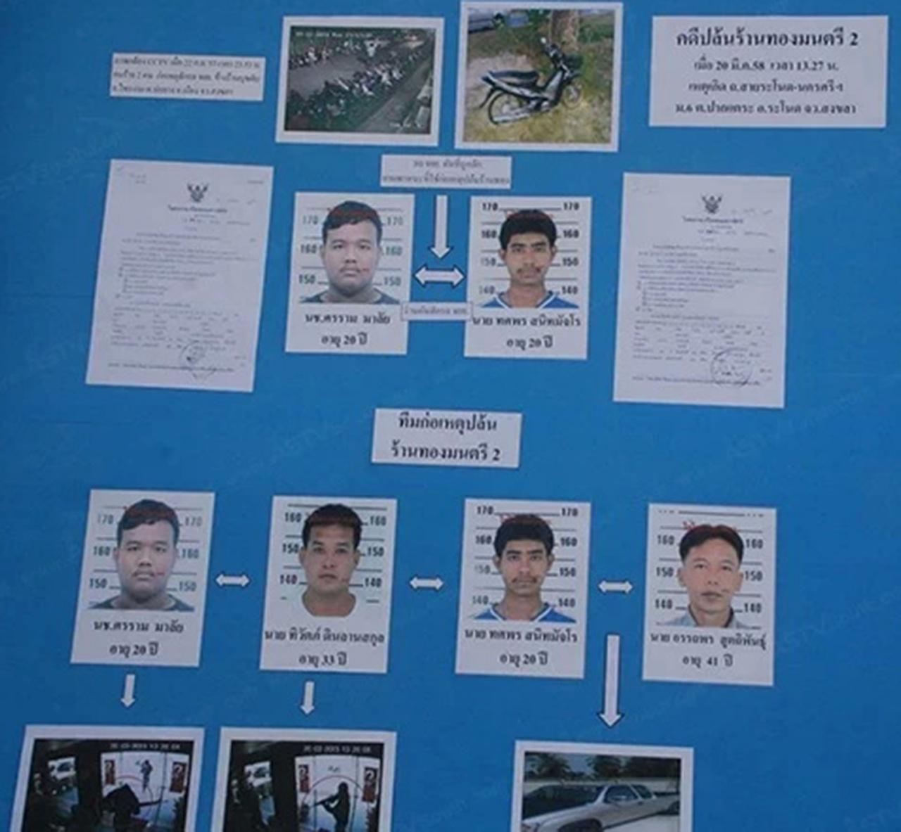 โดยผู้ต้องหารับว่า ก่อเหตุปล้นร้านทองในพื้นที่ อ.ระโนด และ อ.สิงหนคร จ.สงขลา โดยจะมีการขับรถเวียนดูก่อนที่จะลงมือปล้น และจะเลือกร้านทองที่ไม่ติดกรงเหล็ก หลังได้ทองคำประมาณ 200 บาท แล้วก็จะแบ่งกันแล้วแยกย้ายกันไปกบดาน ได้เงินมาก็จะนำไปเที่ยวกิน และเล่นการพนันจนหมด แล้วก็มาก่อเหตุใหม่ แต่ก็มาจนมุมตำรวจชุดสืบสวนจังหวัดเสียก่อน