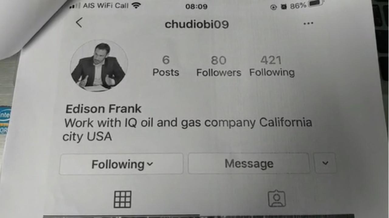 อย่างไรก็ตาม ตนเองไปพบว่าคนที่ชื่อ Edison Frank นั้นได้เปลี่ยนชื่อในไอจี เป็นนายลุค แอนดรูว์ (Luke Andrew) แต่ดันใช้รูปโปร์ไฟล์เหมือนเดิมทุกอย่าง จึงได้รู้แล้วว่าตัวเองถูกหลอก และเรื่องทั้งหมดจะทำกันเป็นขบวนการ หรือที่เรียกกันว่า แก๊งหลอกรักลวงเงิน โรแมนซ์สแกม (romance scam) จึงได้ไปแจ้งความที่ สภ.ปากท่อ เพื่อให้ช่วยติดตาม นางสาวสุมาลี ที่เป็นเจ้าของบัญชีที่รับโอนเงินไปมาดำเนินคดี และติดตามเงินทั้งหมดคืนกลับมา เพราะเชื่อว่าการทำแบบนี้น่าจะทำเป็นขบวนการ และเชื่อว่าน่าจะมีคนที่ถูกหลอกแบบตนเองนั้นหลายรายแล้ว