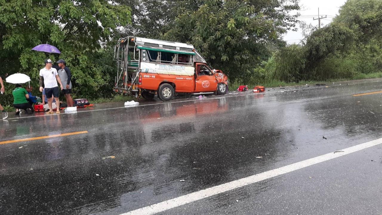 ที่เกิดเหตุ พบรถโดยสารสองแถวสีสัม ยี่หัอนิสสัน หมายเลขทะเบียน 10-1188 กำแพงเพชร สภาพได้รับความเสียหายหน้ารถพังยับ มีผู้ได้รับบาดเจ็บสาหัส 3 ราย คือ นายทิน ศิริกาญจนาไพบูลย์ อายุ 59 ปี ที่อยู่ 123 ซ.1 ถนนเทศา 2 ต.ในเมือง อ.เมืองกำแพงเพชร จ.กำแพงเพชร เป็นคนขับ นางสังเวียร ยอดบ่อพลับ อายุ 73 ปี ชาว จ.กำแพงเพชร เป็นผู้โดยสารนั่งมาข้างคนขับ และนายชาคริต จันทร์ศิริ อายุ 27 ปี ชาว จ.เชียงใหม่ เจ้าหน้าที่นำส่งโรงพยาบาลคลองลาน แต่นายทิน และนางสังเวียร ได้เสียชีวิตในเวลาต่อมา