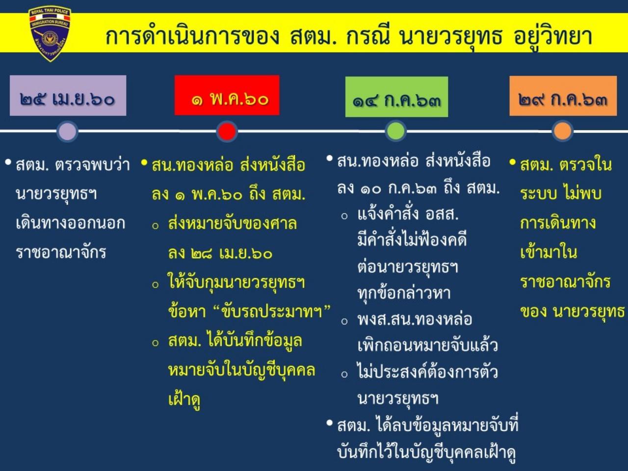 เมื่อวันที่ 30 ก.ค.2563 ผู้สื่อข่าวรายงานว่า พล.ต.ต.สุรพงษ์ ชัยจันทร์ รอง ผบช.สตม. กล่าวถึงกรณีคดีของนายวรยุทธ หรือบอส อยู่วิทยา ว่า ทางสำนักงานตรวจคนเข้าเมือง (สตม.) พบการเดินทางของนายวรยุทธ เมื่อวันที่ 25 เม.ย.2560 ซึ่งก่อนที่ศาลออกหมายจับต่อมาวันที่ 1 พ.ค.2560 สน.ทองหล่อ ทำหนังสือมายัง สตม. โดยแนบหมายจับของศาลที่ออกหมายจับนายวรยุทธ ในข้อหา ขับรถโดยประมาท ซึ่งทาง สตม.ได้บันทึกลงในข้อมูล และระหว่างนั้นเป็นต้นมาก็ไม่พบการเดินทางเข้าประเทศของนายวรยุทธผ่านระบบตรวจคนเข้าเมือง