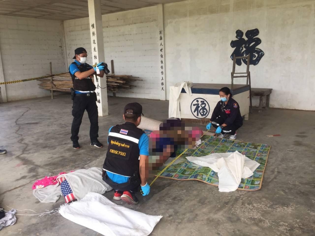 เบื้องต้นพบศพผู้เสียชีวิตนอนบนพรมกำมะหยี่ ศีรษะหนุนหมอนข้างสีชมพู มีผ้าห่มสีขาวคลุมทับ หมอนสีชมพูวางข้างลำตัวด้านขวา ปลายเท้าพบรองเท้าผ้าใบสีดำ และรองเท้าแตะสีดำ ข้างลำตัวด้านซ้ายพบกระเป๋าสีดำ 1ใบ บนศีรษะมีรองเท้าผ้าใบสีดำขนาดเดียวกันอีก 1 ข้าง สวมกางเกงขาสั้นสีน้ำเงิน ไม่สวมเสื้อ ใบหน้าบวม มีเลือดออกปากจมูก ผิวหนังเริ่มพุพอง นอกจากนั้นยังพบเอกสาร ระบุชื่อ คือ นาย sai sar nyo อายุ 36 ปี สัญชาติเมียนมา ไม่พบร่องรอยของการต่อสู้ หรือถูกทำร้าย คาดว่าผู้ตายเสียชีวิตมานานกว่า 24 ชั่วโมง หน้าศาลาที่พบศพยังพบรอยยางรถยนต์ลักษณะขับเข้ามาเหมือนนำศพมาวางไว้ เจ้าหน้าที่พิสูจน์หลักฐานได้ถ่ายภาพเก็บไว้เป็นหลักฐาน