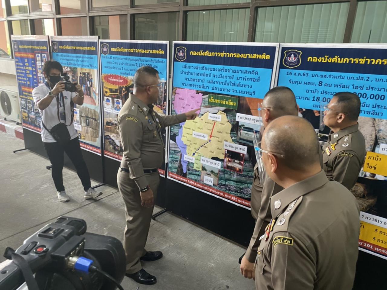 จากกรณีเมื่อวันที่ 16 ส.ค. เจ้าหน้าที่ตำรวจ บก.ขส.บช.ปส. ร่วมกับ บก.ปส.2 บช.ปส. บก.ปส.3 บช.ปส. ภ.จว.นนทบุรี และเจ้าหน้าที่ ป.ป.ส. ได้จับกุมขบวนการค้ายาเสพติดรายสำคัญ เป็นไอซ์ 450 กก. ยาบ้า 5,340,000 เม็ด ยาอี 18,000 เม็ด กัญชา 80 กก. เคตามีน 1 กก. และเฮโรอีน 350 กรัม พร้อมรวบผู้ต้องหาคดียาเสพติด จำนวน 10 คน ได้แก่ 1. นายภาณุมาศ บุญหล้า อายุ 24 ปี บ้านเลขที่ 103 หมู่ 6 ต.กุมภวาปี อ.กุมภวาปี จ.อุดรธานี 2. นายสถาพร คำภูแสน อายุ 24 ปี บ้านเลขที่ 72 หมู่ 13 ต.นาม่วง อ.ประจักษ์ศิลปาคม จ.อุดรธานี 3. นายวิทยา จำปาเงิน อายุ 31 ปี บ้านเลขที่ 107/2 หมู่ 1 ต.ดอนปรู อ.ศรีประจันต์ จ.สุพรรณบุรี