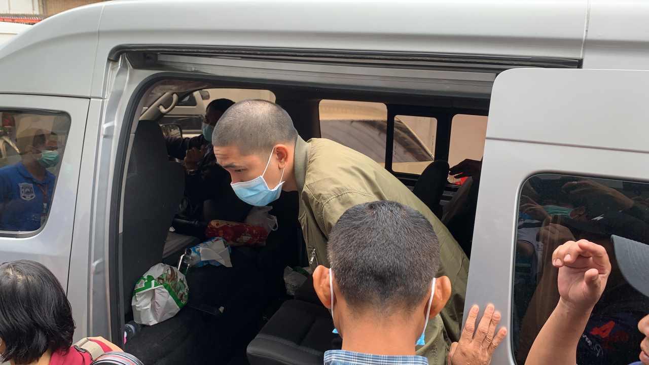 ต่อมาเวลา 14.10น. ตำรวจ สน.สำราญราษฏร์ ควบคุมตัวผู้ต้องหาทั้ง 5 คน ขึ้นรถคุมขังผู้ต้องหาของโรงพักจำนวน 2 คัน เพื่อนำตัวไปส่งยังศาลอาญา โดยทั้งหมดต่างพากันแสดงสัญลักษณ์ด้วยการชู 3 นิ้ว และเดินขึ้นรถไป