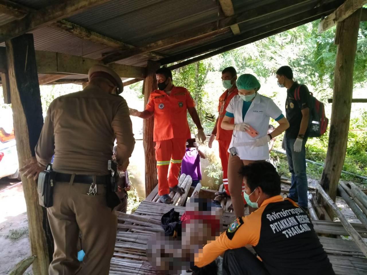 ในที่เกิดเหตุเป็นเพิงพักแบบไม่มีกำแพง พบศพ นายหมิ่วสุ่ย (ไม่มีนามสกุล) ชาวเมียนมา อายุ 40 ปี นอนเสียชีวิตอยู่ภายในเพิงพัก สภาพศพนอนหงายไม่สวมเสื้อ สวมเพียงกางเกงยีนส์ขายาว บริเวณลำคอพบบาดแผลถูกของมีคมปาดเป็นแผลฉกรรจ์ขนาดใหญ่ คอเกือบขาด ตรวจสอบภายในกางเกงของผู้เสียชีวิตพบเงินสดอีกจำนวนหนึ่ง ใกล้ที่เกิดเหตุพบไม้รวกท่อนที่ถูกตัดใหม่ ยาวประมาณ 5-6 เมตร จำนวน 100 กว่าท่อน กองไว้เพื่อรอการขนย้าย