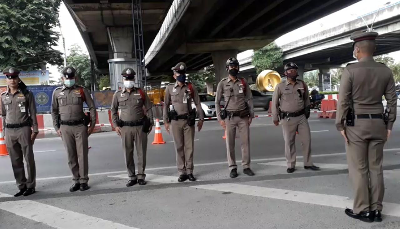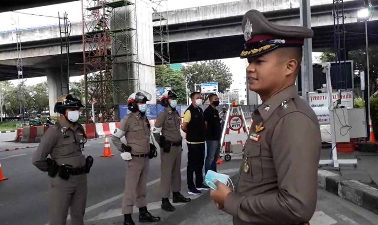 บรรยากาศวันแรกของการตั้งด่านจุดตรวจความมั่นคงและป้องกันอาชญากรรม ในพื้นที่ สน.โชคชัย บริเวณใต้ด่วนลาดพร้าว ถนนประดิษฐ์มนูธรรม ขาเข้า เพื่อรับมือการชุมนุมใหญ่ของนักศึกษา ประชาชน บริเวณอนุสาวรีย์ประชาธิปไตย ถนนราชดำเนิน ในวันที่ 14 ต.ค.63