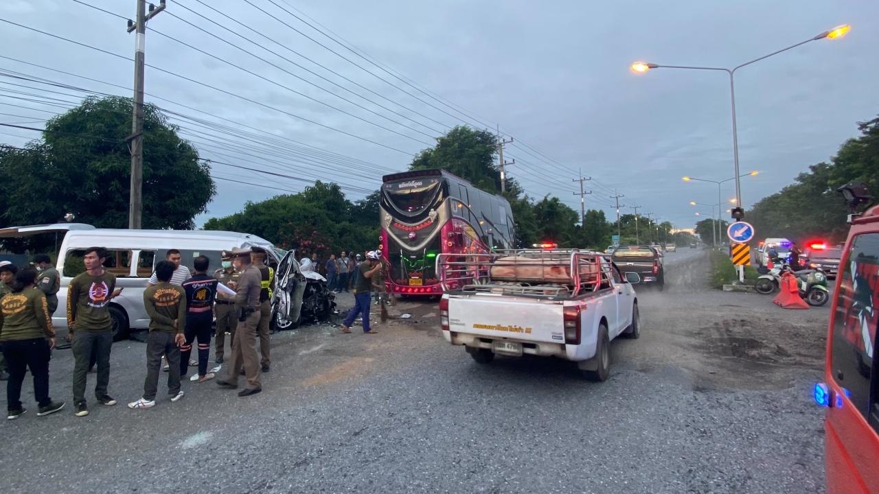 ที่เกิดเหตุพบรถบัส ยี่ห้อวอลโว่ หมายเลขทะเบียน 30-0335 หนองคาย ถูกชนล้อหลังด้านซ้ายพังเสียหาย ใกล้กันพบรถตู้ยี่ห้อโตโยต้า สีบรอนซ์ หมายเลขทะเบียน นข 2565 นครนายก สภาพพังเสียหายยับเยิน มีสติกเกอร์ติดหน้ารถว่า ปี่พาทย์ ณัฐพล ลูกพ่อแก่ ศิษฤาษีเณร เจ้าหน้าที่กู้ภัยฯระดมกำลังใช้เครื่องมือตัดถ่างเข้าทำการช่วยเหลือนำส่ง รพ.นครนายก และ รพ.บ้านนา โดยมีผู้เสียชีวิตภายในรถ 3 คน และไปเสียชีวิตที่โรงพยาบาล 1 คน ทราบชื่อคือ นายวีรวัฒน์ แดงศรี อายุ 52 ปี คนขับและเป็นเจ้าของวงปี่พาทย์ นายณัฐพล แดงศรี อายุ 20 ปี ลูกชาย อยู่บ้านเลขที่ 109/1 หมู่ 2 ต.ท่าทราย อ.เมืองนครนายก นางนงค์นุฎ สายสุด อายุ 54 ปี อยู่บ้านเลขที่ 124/1 หมู่ 6 ต.พรหมณี อ.เมืองนครนายก และนายประจบ อ่อนวงษ์ อายุ 49 ปี