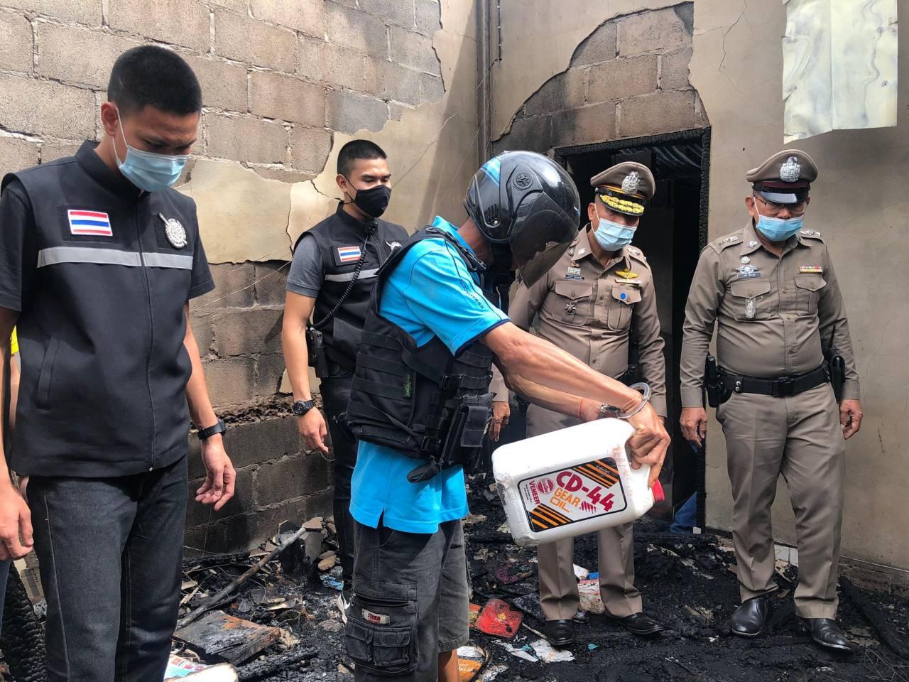 สำหรับจุดแรกได้คุมตัวผู้ต้องหาไปชี้จุดภายในบ้านที่เกิดเพลิงไหม้ ซึ่งผู้ต้องหาสารภาพว่าเกิดอาการคุ้มคลั่งประสาทหลอน เนื่องจากป่วยทางจิตมานานหลายปี แต่ขาดการกินยารักษาประมาณ 3 เดือน จึงเกิดอาการประสานหลอน จึงใช้ค้อนตีตะปูทุบทำร้ายเมียที่ศีรษะแบบไม่ตั้งตัวจนหมดสติ จากนั้นได้ใช้ค้อนทุบศีรษะลูกชายที่อยู่ในบ้านจนหมดสติ และใช้ผ้าห่ม รวมถึงเสื้อผ้า ไปกองทับร่างทั้ง 2 คนที่หมดสติ พร้อมนำแกนลอนน้ำมัน ที่ใช้เติมรถไถนา ไปราดและจุดไฟเผา ทำให้ไฟลุกไหม้บ้านเสียหายทั้งหลัง รวมถึงร่างภรรยากับลูกชายถูกเผาเป็นตอตะโก