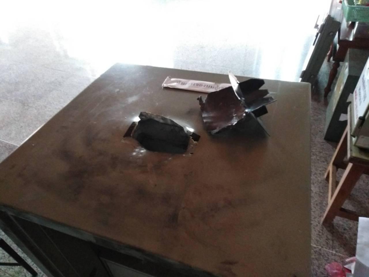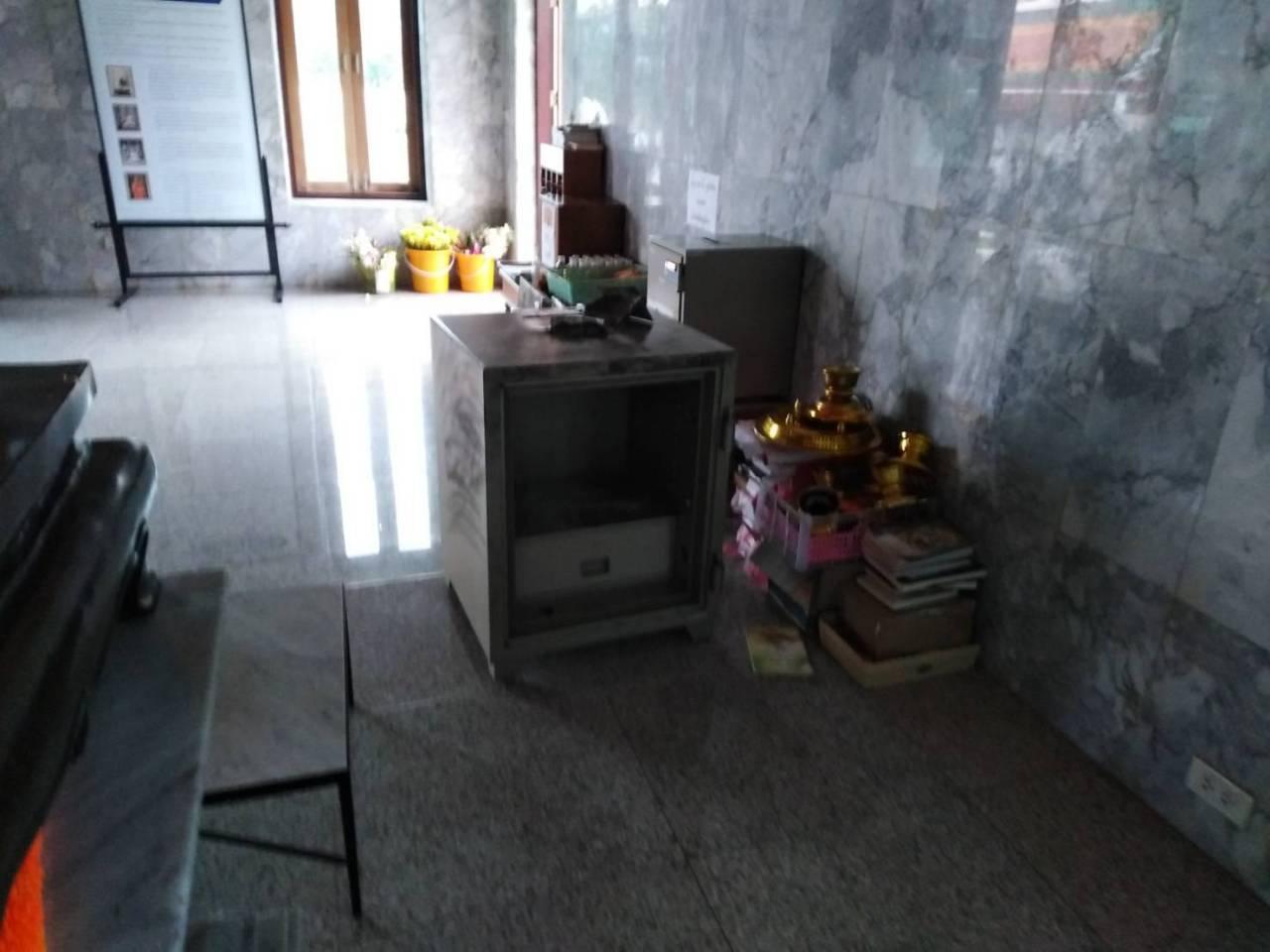 ส่วนจุดที่สองห่างไปทางด้านข้างวิหาร 15 เมตร เป็นศาลาบูชาวัตถุมงคลของทางวัด มีลักษณะเป็นอาคารสูงชั้นเดียว ทางเข้าเป็นประตูไม้เปิดปิด 2 บาน ประกอบกระจกใสที่ประตูข้างละ 3 แผ่น พบร่องรอยกระจกแผ่นล่างสุดของประตูฝั่งซ้ายถูกทุบจนแตก ทำให้คนร้ายมุดตัวเข้าไปภายในลักทรัพย์วัตถุมงคลในตู้โชว์ อาทิ เหรียญหลวงปู่เอี่ยม พ.ศ.2515 เหรียญ 3 เจ้าอาวาส และรูปหล่อหลวงปู่เอี่ยมไปได้หลายรายการ เบื้องต้นเจ้าหน้าที่กองพิสูจน์หลักฐานทำการเก็บลายนิ้วมือแฝงของคนร้ายเอาไว้ เพื่อนำไปเปรียบเทียบกับประวัติอาชญากรของคดีอื่นๆ ต่อไป