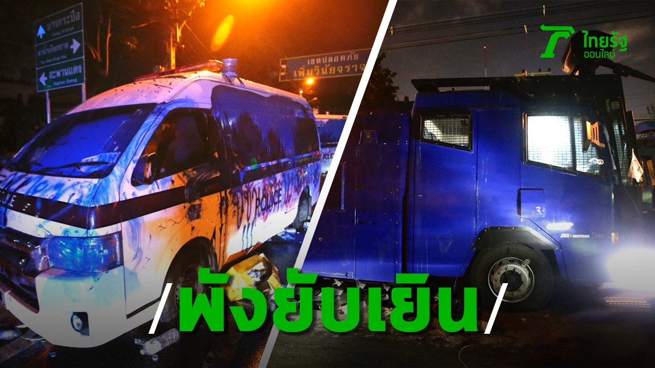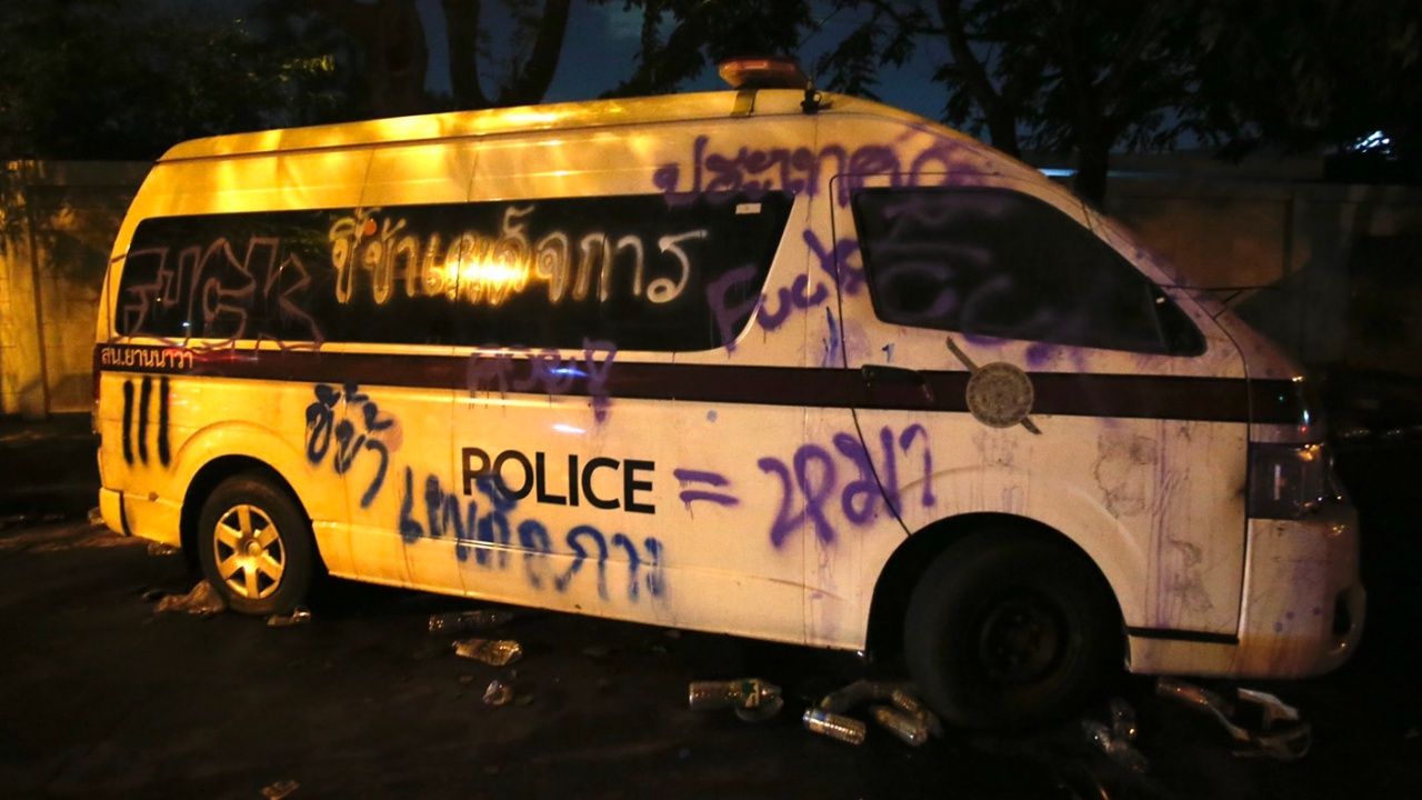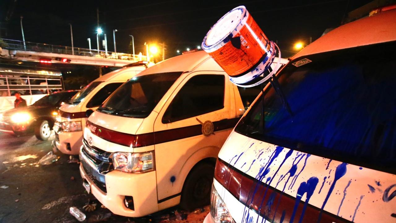 โดยพบว่า “รถฉีดน้ำแรงดันสูง” หรือที่เรียกกันว่า “จีโน่” ที่ใช้ควบคุมฝูงชน นำเข้ามาจากประเทศเกาหลีใต้ ในราคาคันละ 25 ล้านบาท จำนวน 2 คัน ถูกพ่นสีสเปรย์ด้วยข้อความต่างๆ และยังมีรถน้ำอีกคันหนึ่งถูกปล่อยลมยาง นอกจากนี้ยังมีรถตู้และรถบัสของตำรวจ รวมทั้งรถยนต์-รถจักรยานยนต์ของประชาชนที่จอดอยู่ในบริเวณดังกล่าว ถูกฉีดสีสเปรย์ใส่และทุบทำลายเสียหายอีกหลายคัน