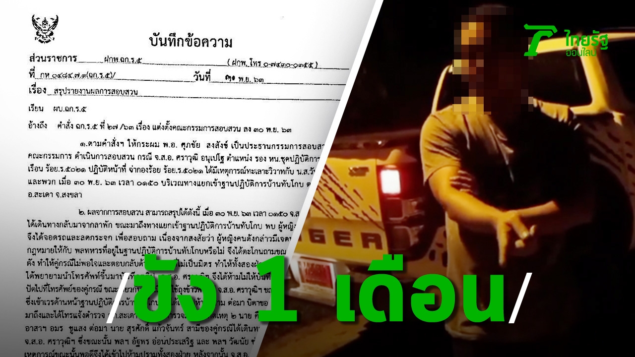 “รอง ผบ.ฉก.ร.5” สั่งขัง "จ่าบอย" 1 เดือน ส่งฝึกธำรงวินัยอีก 5 วัน หลังมึนเมาทะเลาะวิวาท ทำร้ายร่างกาย 2 สามีภรรยา ส่วน "ร.อ." ผู้บังคับบัญชาโดนด้วย กักบริเวณ 9 วัน ฝึกธำรงวินัย 3 วัน