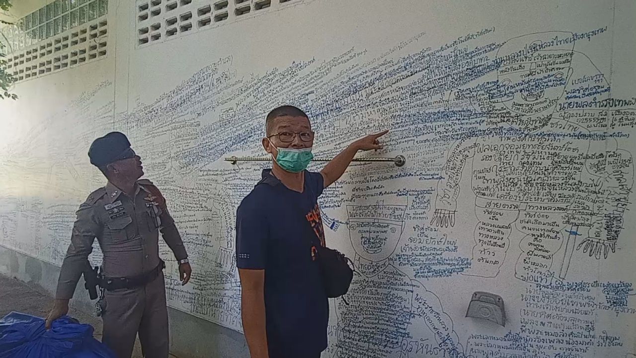 บริเวณที่พักอาศัย พบอักขระและเครื่องรางของขลังบริเวณซอกตึก รวมทั้งข้อความบนผนัง กำแพงรั้ว และเสาคอนกรีตหน้าอาคาร ที่เขียนด้วยปากกาเมจิกจากลายมือของหนุ่มสติไม่ดี ทราบเพียงชื่อเล่นว่า “จ่อย” อายุประมาณ 30 ปี เป็นชาว อ.สามชัย จ.กาฬสินธุ์ ที่เมื่อ 6 เดือนที่ผ่านมา ไปก่อเหตุลักทรัพย์แม่ค้าภายในตลาด แต่แม่ค้าไม่เอาความ เนื่องจากเห็นว่าสติไม่สมประกอบ จึงมอบให้ตำรวจนำตัวส่งกลับบ้าน แต่นายจ่อย ก็เดินทางกลับมาอาศัยอยู่ในชุมชนโนนสูงเหมือนเดิม