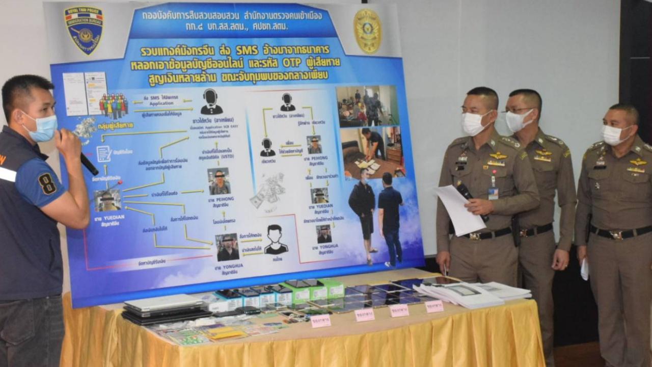 พล.ต.ท.สมพงษ์ กล่าวว่า การจับกุมครั้งนี้สืบเนื่องจากทางธนาคารไทยพาณิชย์ได้แจ้งข้อมูลให้ทราบว่า ช่วงนี้มีประชาชนซึ่งเป็นลูกค้าของธนาคารหลายรายตกเป็นเหยื่อแก๊ง PHISHING ส่ง SMS เป็น LINK แพลตฟอร์มปลอมของทางธนาคาร โดยอ้างว่าเป็นการอัปเดตระบบธุรกรรมการเงินออนไลน์เข้าไปที่เบอร์มือถือ ก่อนจะหลอกเอาข้อมูลส่วนตัวรวมทั้งรหัส OTP ไปทำการโอนเงินจากในบัญชีของผู้เสียหาย จึงมอบหมายให้ กก.4 บก.สส.สตม.ดำเนินการสืบสวนจับกุม จนพบว่าผู้กระทำความผิดเป็นกลุ่มขบวนการชาวไต้หวันและชาวจีน ที่มีทั้งผู้ต้องหาส่วนที่อยู่ในต่างประเทศและผู้ต้องหาที่ลักลอบเข้ามาอยู่ในราชอาณาจักรไทยร่วมมือกัน โดยข้อมูลที่ได้จากการหลอกลวงเหยื่อผ่านการส่ง SMS นั้น ทางกลุ่มผู้ต้องหาจะนำไปสมัครลงในแอปพลิเคชัน SCB EASY เพื่อยักย้ายถ่ายโอนเงินเข้าบัญชีธนาคารต่างๆ ของไทย ที่กลุ่มผู้ต้องหาทั้ง 3 คนที่เตรียมเอาไว้ ก่อนที่จะมีการแลกเปลี่ยนเงินสกุลไทยเป็นเงินดอลลาร์สหรัฐดิจิตอล เพื่อโอนออกไปยังบัญชีของนายทุนที่ไต้หวันอีกทอดหนึ่ง