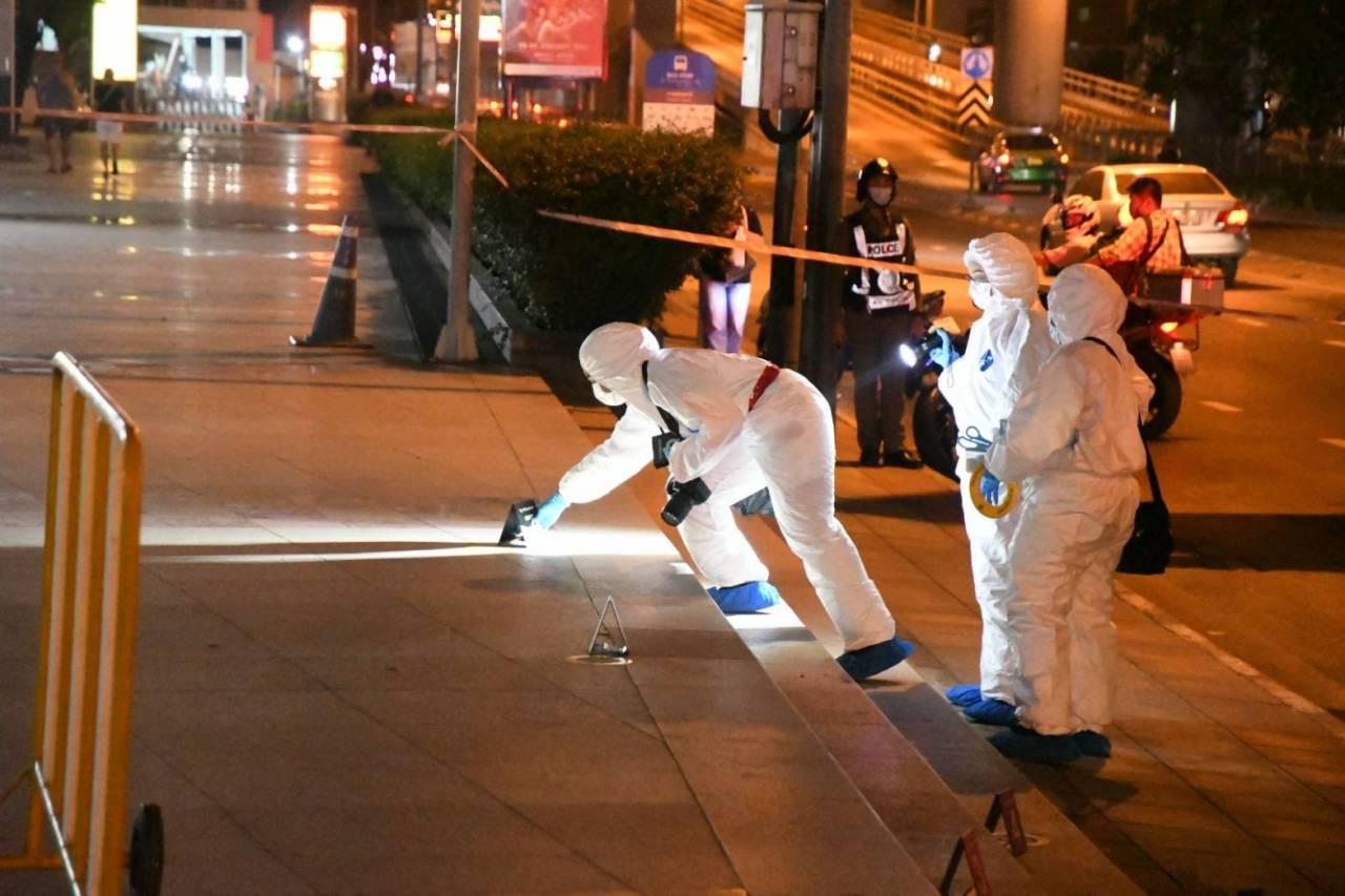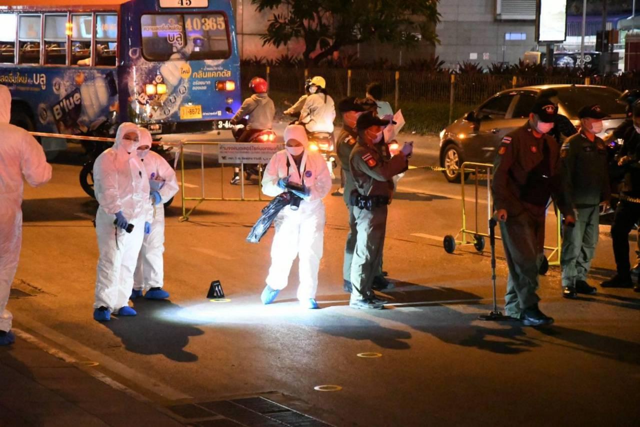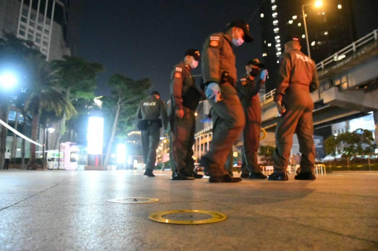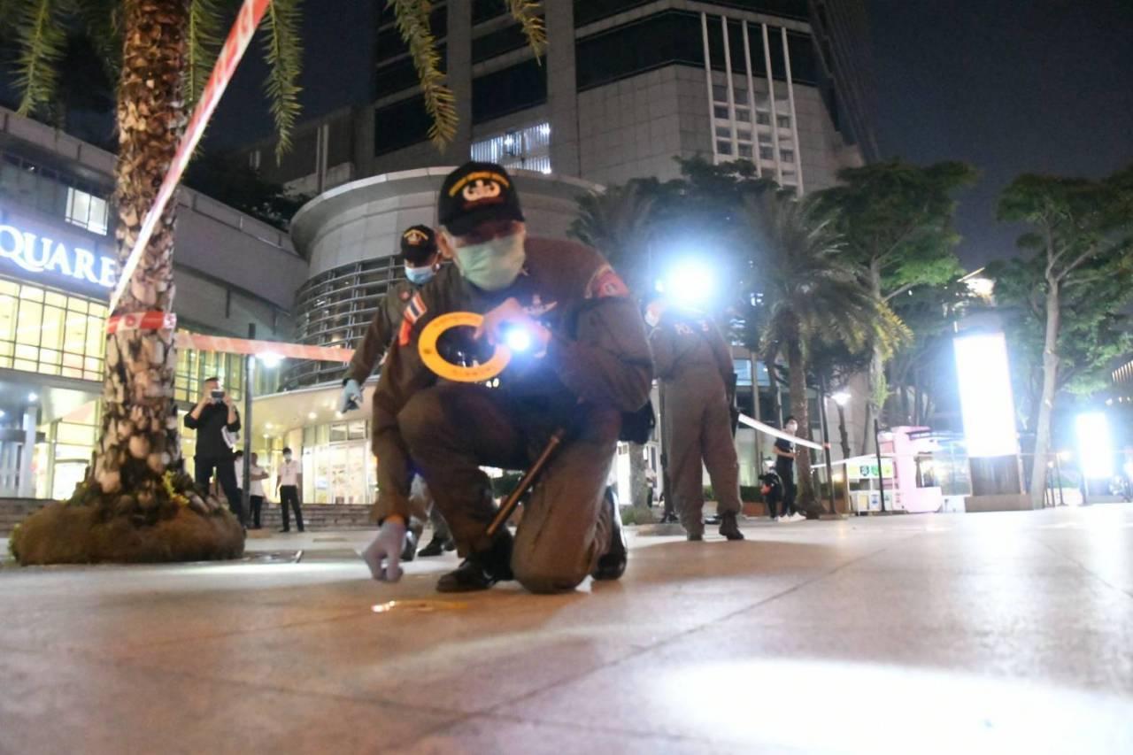 เจ้าหน้าที่จากกองพิสูจน์หลักฐานเข้าตรวจสอบที่เกิดเหตุ ระเบิดหน้าจามจุรีสแควร์ ขณะที่ อีโอดี เข้าพิสูจน์วัตถุระเบิดพบระเบิดปิงปอง เป็นระเบิดแรงดันต่ำใส่ตะปูรวม 4 ตัว จุดระเบิดโดยปาลงพื้น