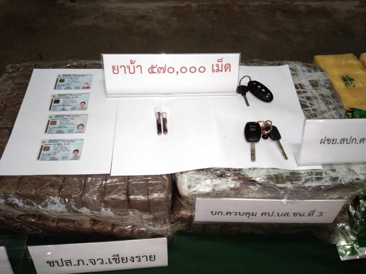 เมื่อเช้าวันที่ 17 ก.พ. 64 ร.ต.อ.จักรพงษ์ อินตะนิล รอง ผบ.ร้อย 327 รักษาการ หน.ชป. ตชด.แม่สาย ร่วมกับ ศอ.ปส.บก.ตชด.ภาค 3 กก.ตชด.33 ตชด.327 ตำรวจ สภ.แม่จัน สืบทราบว่าจะมีขบวนการลักลอบขนยาเสพติดจากชายแดนแม่สายไปส่งภาคใต้ จึงออกสืบสวนจนกระทั่งพบรถฮอนด้า แอคคอร์ด สีดำ ทะเบียน 1 ขต 7526 กรุงเทพมหานคร วิ่งนำหน้ารถนิสสัน มาร์ช สีบรอนซ์เงิน ทะเบียน กย 2721 เชียงราย เข้าไปพักในรีสอร์ตแห่งหนึ่ง บ.น้ำจำ ต.โป่งผา ตรงตามที่ได้รับรายงาน เจ้าหน้าที่จึงกระจายกำลังเฝ้าสังเกตการณ์ จนกระทั่งพบชายหญิง 4 คน เดินออกมาจากห้องพักไปขึ้นรถ เจ้าหน้าที่จึงแสดงตัวค้นรถนิสสัน มาร์ช พบยาบ้าจำนวน 570,000 เม็ด วางไว้ที่พักเท้าเบาะหลังคนขับ และในกระโปรงท้ายรถพบยาไอซ์ 4 ถุงใหญ่ รวมน้ำหนัก 14 กก. ส่วนรถฮอนด้า แอคคอร์ด สีดำ ทะเบียน 1 ขต 7526 กรุงเทพมหานคร ไม่พบสิ่งของผิดกฎหมายแต่อย่างใด