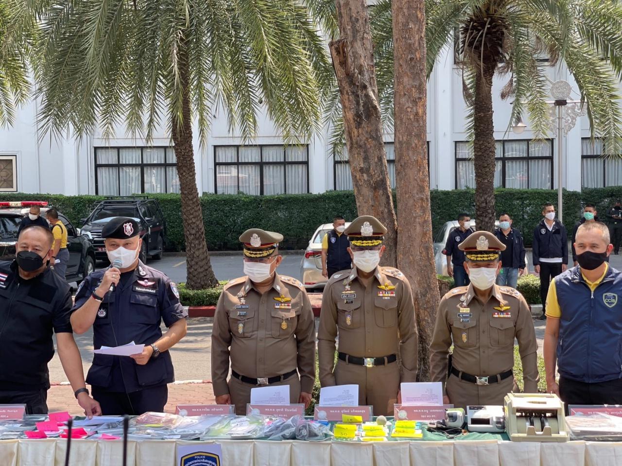 สำนักงานตำรวจแห่งชาติ เมื่อเวลา 13.30 น. วันที่ 24 ก.พ. พล.ต.อ.สุวัฒน์ แจ้งยอดสุข ผบ.ตร. พล.ต.ท.กรไชย คล้ายคลึง ผู้บัญชาการตำรวจสืบสวนสอบสวนอาชญากรรมทางเทคโนโลยี บช.สอท. แถลงผลการปฏิบัติการทลายองค์กรอาชญากรรมไซเบอร์ฟอกเงินข้ามชาติ ตรวจค้น 8 จุด จับกุมผู้ต้องหาตามหมายจับได้ 19 ราย จับกุมความผิดซึ่งหน้า 15 ราย พร้อมของกลางหลายรายการ ประกอบด้วย รถยนต์ 8 คัน บัญชีธนาคาร 45 บัญชี เงินสด จำนวน 2 ล้านบาท และมือถือ 54 เครื่อง