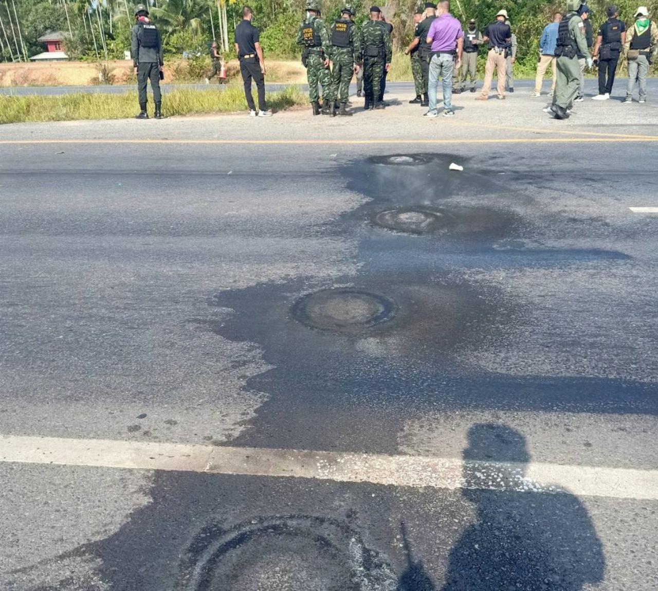 ขณะเดียวกันที่ อ.เมืองยะลา พ.ต.อ.นราวี บินแวอารง ผกก.สภ.เมืองยะลา นายวันสุกรี แวมามะ ป้องกันจังหวัดยะลา นายธราวุธ ช่วยเกิด นายอำเภอเมืองยะลา เจ้าหน้าที่ชุดเก็บกู้วัตถุระเบิด “ศรศึก-ศรชัย” ภ.จว.ยะลา ศูนย์พิสูจน์หลักฐาน 10 ยะลา สนธิกำลัง 3 ฝ่าย เดินทางไปตรวจสอบหลังรับแจ้งว่าเหตุ มีคนร้ายเผายางรถยนต์บนถนนสาย 418 (ยะลา-ปัตตานี) ฝั่งขาเข้าเมืองยะลา จุดเกิดเหตุอยู่ในพื้นที่บ้านสาคอ หมู่ 4 ต.ท่าสาป ห่างจากเขตเทศบาลนครยะลาราว 1 กิโลเมตรเศษ พบจุดที่คนร้ายลอบเผายางรถยนต์ 4 จุด รวมจำนวน 4 เส้น นอกจากนั้นยังพบวัตถุต้องสงสัยวางอยู่ที่โคนเสาป้ายสัญญาณห้ามกลับรถบริเวณหัวมุมกลางถนน ไม่ห่างจากที่เกิดเหตุมากนัก เจ้าหน้าที่ชุดเก็บกู้วัตถุระเบิดเข้าตรวจสอบพร้อมยิงทำลาย ปรากฏว่าเป็นเพียงอิฐบล็อกพันเทปกาวสีครีม จึงได้เก็บรวบรวมไว้เป็นหลักฐาน
