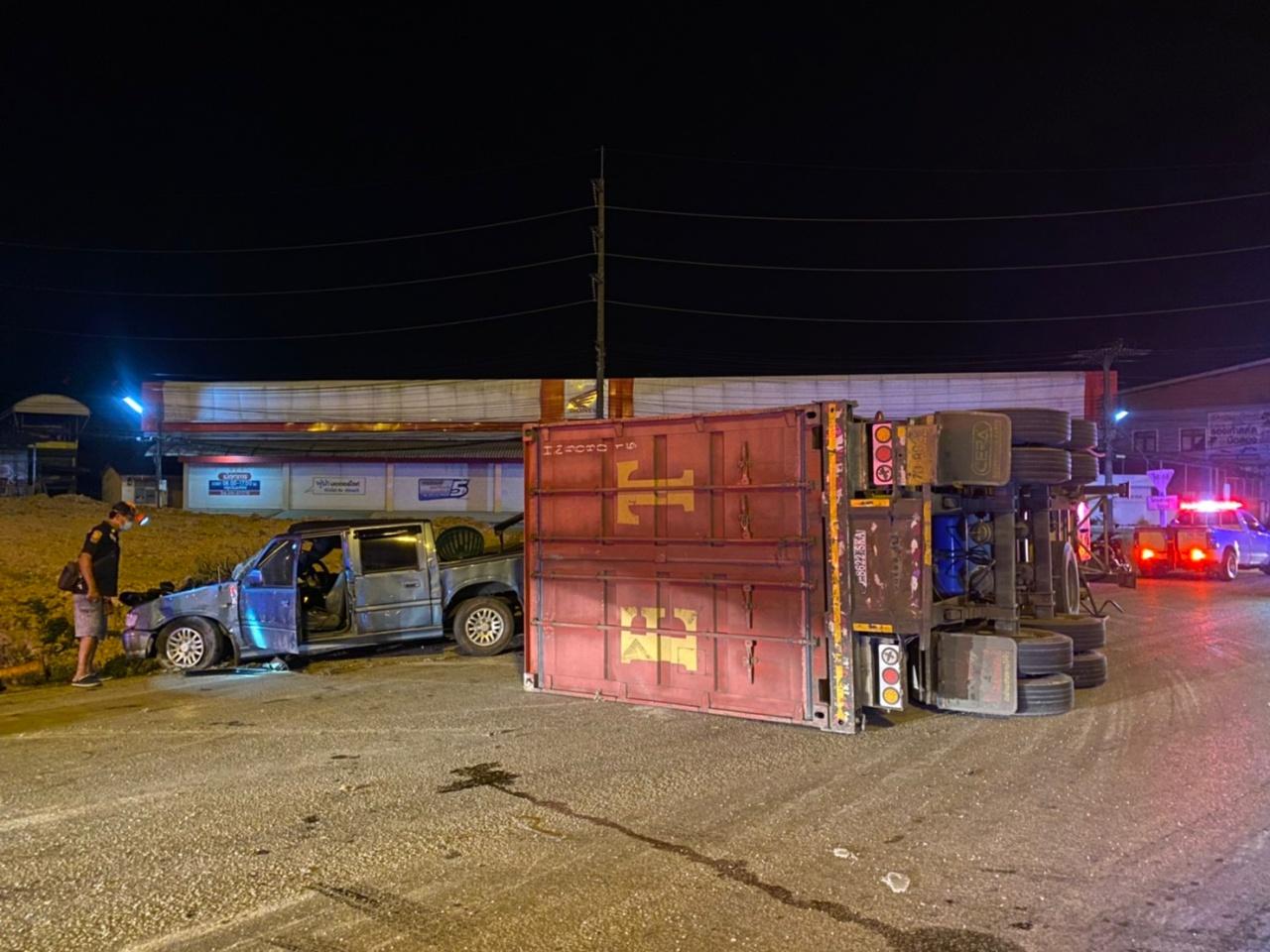 ห่างกันเจ้าหน้าที่พบรถเทรลเลอร์ หมายเลขทะเบียน 70-8621 จังหวัดสงขลา เป็นของบริษัทขนส่ง เอ็งไทย โลจิสติก (ไทยแลนต์) จำกัด สภาพส่วนหัวลากได้รับความเสียหายพังยับเยิน และมีตู้คอนเทนเนอร์หลุดพลิกคว่ำอยู่กลางถนน โดยที่เกิดเหตุพบผู้เสียชีวิต 1 ราย ทราบชื่อคือ นายชัยวัฒน์ สุวรรณโณ อายุ 60 ปี อยู่บ้านเลขที่ 27/2 หมู่ที่ 7 ตำบลสทิงหม้อ อำเภอสิงห์นคร จังหวัดสงขลา ส่วนเพื่อนอีกคนได้รับบาดเจ็บอาการสาหัส ซึ่งทั้งคู่ได้กระเด็นออกมาจากตัวรถ