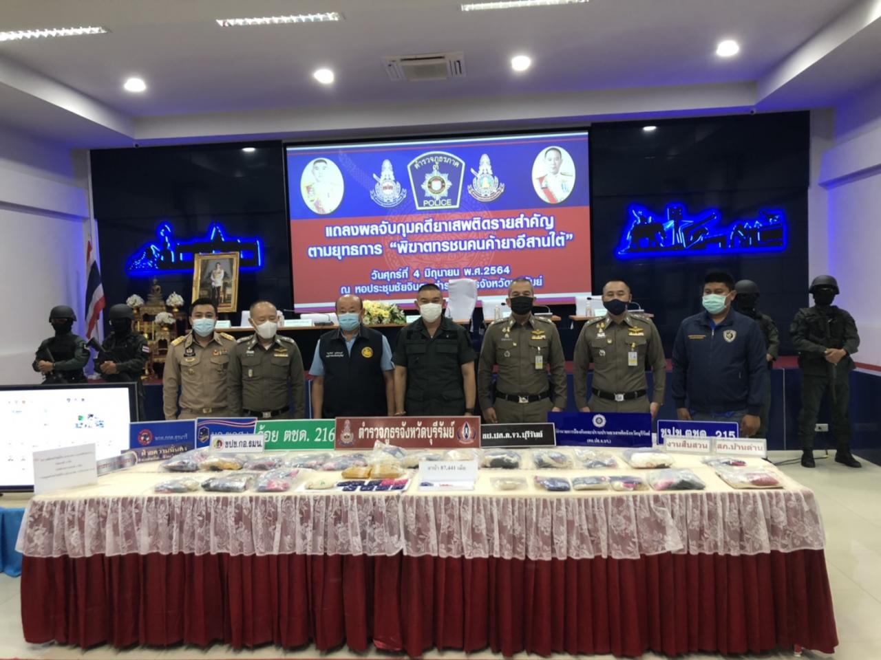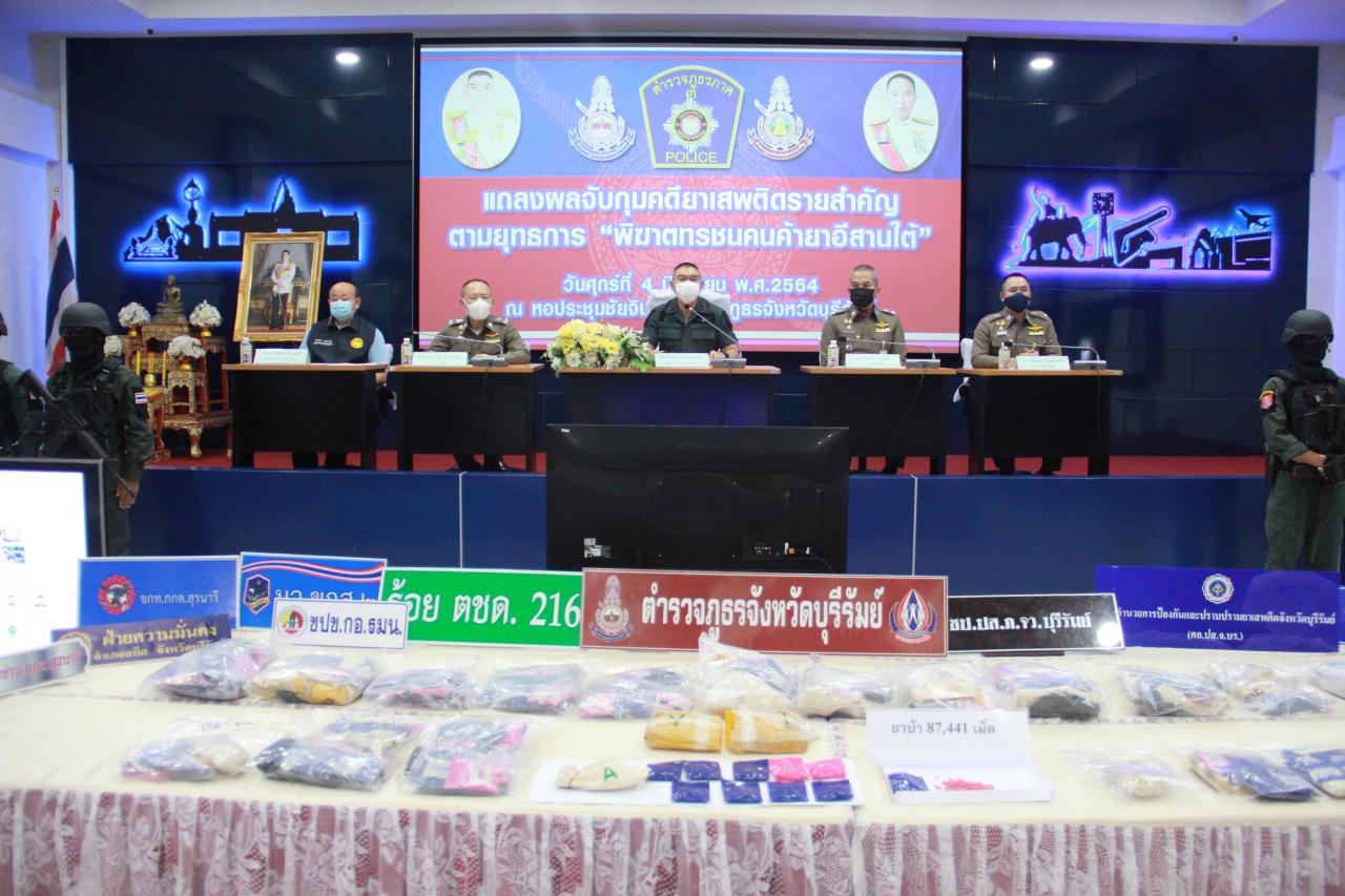 เมื่อเวลา 16.00 น. วันที่ 4 มิ.ย. 64 ที่หอประชุมชัยจินดา ตำรวจภูธรจังหวัดบุรีรัมย์ พล.ต.ท.ภาณุรัตน์ หลักบุญ ผบช.ภ.3, พล.ต.ต.คีรีศักดิ์ ตันตินวะชัย รอง ผบช.ภ.3 (หน.ปส), นายไชยวัฒน์ จุนถิระพงศ์ รองผู้ว่าฯ บุรีรัมย์ พล.ต.ต.รุทธพล เนาวรัตน์ ผบก.ภ.จว.บุรีรัมย์, พ.ต.อ.ก้องชาติ เลี้ยงสมทรัพย์ รอง ผบก.ภ.จว.บุรีรัมย์, แถลงข่าวผลงานการบูรณาการสนธิกำลังร่วมกันระหว่าง ตำรวจ ชป.ปส.ภ.จว.บุรีรัมย์, ตชด.215, ตชด.216, สภ.เมืองบุรีรัมย์, สภ.คูเมือง, สภ.กระสัง, สภ.เฉลิมพระเกียรติ, เจ้าหน้าที่ส่วนปฏิบัติการข่าวและปราบปรามยาเสพติด 7, ตำรวจ กก.สส.ภ.จว.อำนาจเจริญ, ตำรวจ กก.3 บก.ป.ทหาร สขว.กอ.กรมน., ทหารชุดปฏิบัติการข่าว ขกท.ศปก.ทบ.(มว.ขกส.2, ขกท.กกล.สุรนารี) และฝ่ายปกครอง อ.สตึก สามารถจับกุมผู้ต้องหาคดียาเสพติดรายสำคัญในพื้นที่ จ.บุรีรัมย์ ได้ผู้ต้องหา 21 คน ของกลางยาบ้า 87,441 เม็ด ตรวจยึดทรัพย์สินตาม พ.ร.บ.มาตรการฯ พ.ศ. 2534 รถยนต์ 4 คัน, รถจักรยานยนต์ 2 คัน และทรัพย์สินอื่นๆ รวมมูลค่าทรัพย์สินประมาณ 2,535,000 บาท
