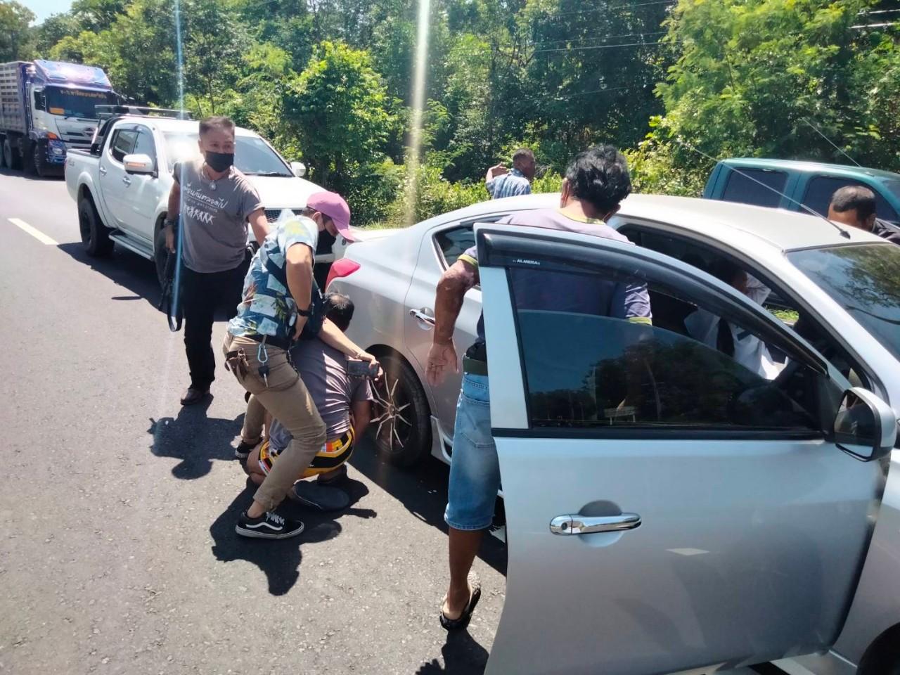 โดยสามารถจับกุมตัว นายไตรภพ หรือบอล หาญสุวรรณ อายุ 31 ปี ชาว อ.นางรอง จ.บุรีรัมย์ ได้ในพื้นที่ อ.เมือง จ.บุรีรัมย์ ในข้อหาเสพยาเสพติด พร้อมรับสารภาพว่า ตนกำลังเดินทางมารอรับยาบ้า ที่จะมีผู้นำยาบ้ามาส่งให้จำนวน 5 มัด หรือประมาณ 10,000 เม็ด ที่บริเวณถนนหน้าสนามบินบุรีรัมย์ แต่ยังไม่ได้รับยาบ้ากลับมาถูกจับกุมได้เสียก่อน เจ้าหน้าที่จึงได้วางแผนดักจับกุมตามจุดต่างๆ ที่คาดว่าจะมีการนำยาบ้ามาวางไว้ให้ลูกค้า หลังจากนั้นเจ้าหน้าที่สังเกตเห็น รถยนต์เก๋งยี่ห้อนิสสัน ทะเบียน กธ 3538 มหาสารคาม จอดอยู่บริเวณหลักกิโลเมตร และมีผู้ชายถือสิ่งของนำไปวางบริเวณหลักกิโลเมตรพอดี จากนั้นได้มีโทรศัพท์โทรติดต่อเข้ามาหานายไตรภพ พร้อมแจ้งว่าได้นำยาบ้าไปวางไว้ให้หลังหลักกิโลเมตร ริมถนนหน้าสนามบินบุรีรัมย์ ซึ่งเป็นจุดที่เจ้าหน้าที่สังเกตเห็นพอดี เจ้าหน้าที่จึงสกัดจับรถยนต์คันดังกล่าว ได้ที่บริเวณแยกไฟแดงสนามบินบุรีรัมย์ พบเป็น 2 สามีภรรยากันคือ นายธนากร หรือตุ้ม สิงหปุรางกูร อายุ 49 ปี กับนางอรศรี หรือปุ๊ เรืองโสม อายุ 38 ปี ชาว อ.เขมราฐ จ.อุบลราชธานี พบของกลางยาบ้า 75,510 เม็ด โพยบัญชีลูกค้า และโทรศัพท์มือถือ วางซุกซ่อนอยู่ในรถคันดังกล่าว เจ้าหน้าที่จึงตรวจยึดไว้เป็นหลักฐาน และได้ทำการขยายผล เพื่อจับกุมลูกค้าที่ได้ติดต่อซื้อยาบ้า และจะมารอรับยาบ้าตามโพยบัญชีลูกค้าที่ตรวจพบ ซึ่งเป็นการจับกุมตามการส่งมอบภายใต้การควบคุมของเจ้าหน้าที่ CD ได้จำนวน 14 คน เป็นลูกค้าที่อยู่ในพื้นที่ จ.บุรีรัมย์ และ จ.สุรินทร์