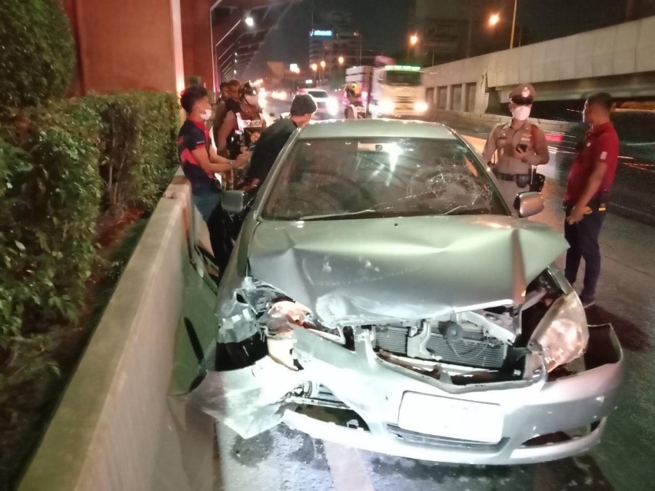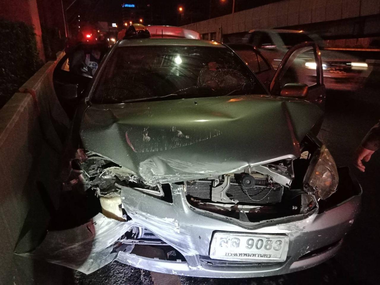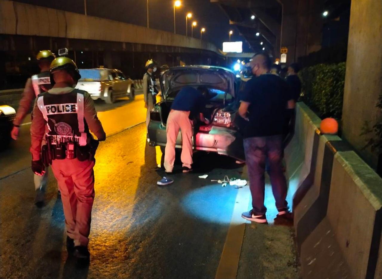 จากนั้นได้รถคันดังกล่าวใช้ถนนรามอินทรา ขาเข้า มุ่งหน้าวงเวียนบางเขน ถนนแจ้งวัฒนะ หลักสี่ โดยมีตำรวจสายตรวจขี่รถ จยย.เข้าประกบข้างตลอด แต่รถยนต์คันดังกล่าวก็พยายามขับเบียด เจ้าหน้าที่จึงใช้อาวุธปืนยิงที่ยางล้อหลัง จำนวน 3 นัด จนรถคันดังกล่าวขับเลี้ยวเข้าถนนวิภาวดี-รังสิต ขาเข้าในช่องทางด่วน ก่อนจะเสียหลักพุ่งชนแบริเออร์คอนกรีตกลางถนนอย่างแรง จนสภาพรถพังยับเยิน ยางล้อหลังแตกไม่สามารถไปต่อได้ รวมระยะทางประมาณ 6-7 กิโลเมตร