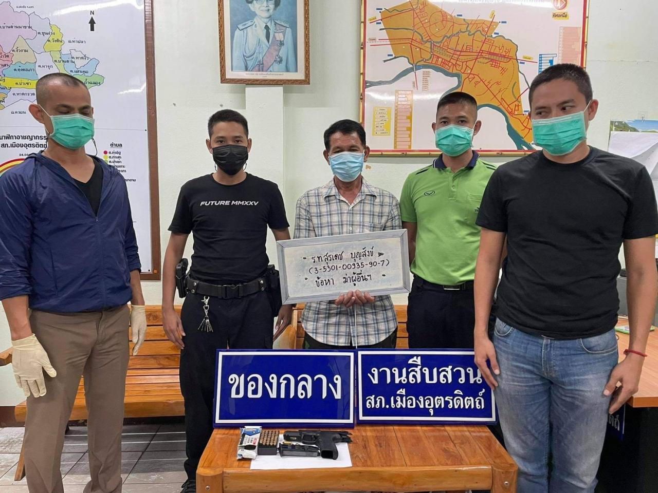 ร.ต.อ.เลข กล่าวว่า หลังจากการสอบสวน ร.ท.สุรเดช บุญสังข์ อายุ 62 ปี อดีตทหารปลดเกษียณ อยู่บ้านเลขที่ 26/1หมู่ 5 ต.ผาจุก อ.เมือง จ.อุตรดิตถ์ ให้การว่า เป็นคู่เขยซึ่งบ้านรั้วติดกัน และทะเลาะมานานหลายปี ซึ่งก่อนที่จะยิงได้เกิดเหตุทะเลาะกัน จึงใช้ปืนยิงผ่านรั้วไปหลายนัด จนคู่เขยเสียชีวิต และได้ยืนรอมอบตัวกับเจ้าหน้าที่ตำรวจในที่เกิดเหตุ ส่วนของกลางอาวุธปืนพกสั้นกึ่งอัตโนมัติ ยี่ห้อ บาเรตต้า สีดำ ขนาด 9 มม. หมายเลขทะเบียน กท 4922135 จำนวน 1 กระบอก
