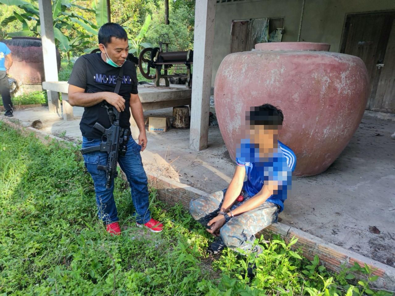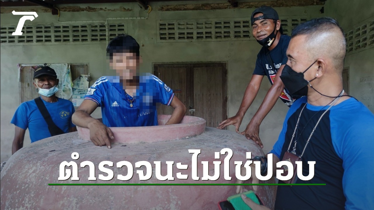 เมื่อไปถึงพบวัยรุ่นนั่งกันอยู่กันสามคน เมื่อเห็นตำรวจมา ต่างพากันวิ่งหลบหนีไปทางสวนทุเรียนข้างบ้าน 2 คน และตามจับกุมไว้ได้ 1 คน ส่วนอีกคนไม่สามารถไล่ติดตามได้ทัน จากนั้นจึงมาช่วยกันตามหาวัยรุ่นที่วิ่งไปทางหลังบ้าน แต่หาเท่าไรก็หาไม่เจอ ทั้งๆ ที่ไม่มีเส้นทางหลบหนีแล้ว หลังผ่านไปเกือบชั่วโมง ตำรวจสังเกตเห็นโอ่งใบใหญ่ที่ตั้งอยู่บริเวณหลังบ้าน ใกล้กับจุดที่คนร้ายวิ่งหายไป เมื่อชะโงกหน้าเข้าไปดูภายในโอ่ง พบคนร้ายดังกล่าวนั่งยิ้มอยู่ภายในโอ่ง จึงเรียกให้ขึ้นมาก่อนเข้าจับกุมตัวเอาไว้ได้