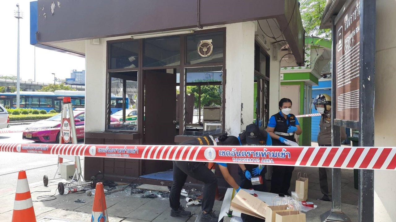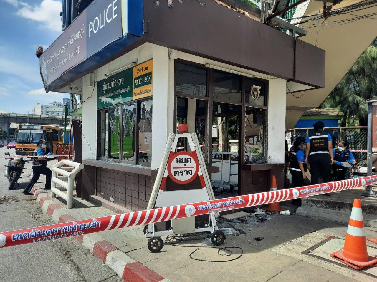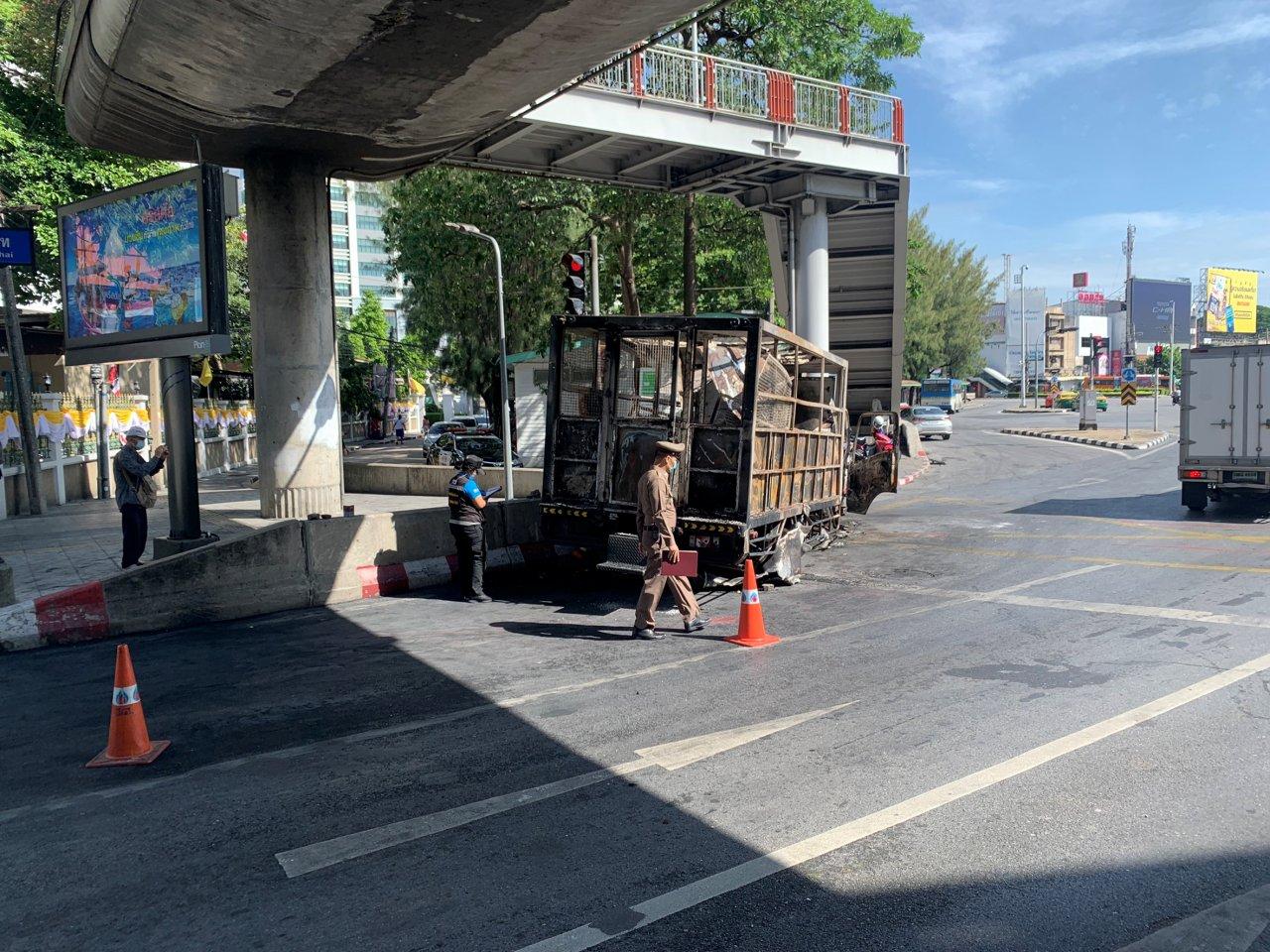 เจ้าหน้าที่ พฐ.เก็บหลักฐานรถยนต์ควบคุมผู้ต้องหาถูกเผาวอดทั้งคัน และป้อมจราจรถูกทุบพังยับเยิน บริเวณอนุสาวรีย์ชัยสมรภูมิ เพื่อเร่งติดตามคนก่อเหตุมาดำเนินคดี