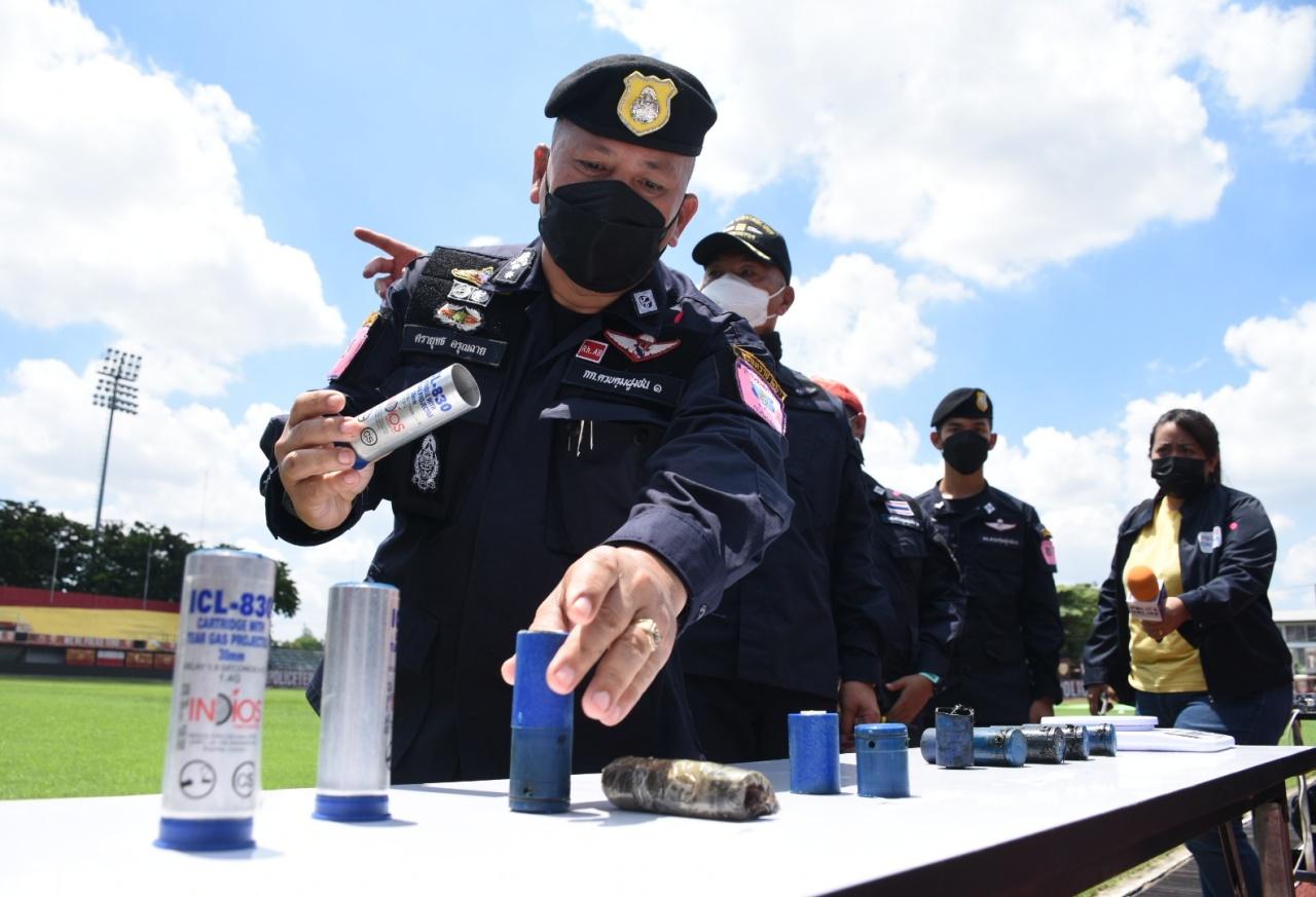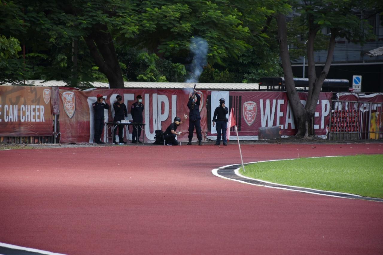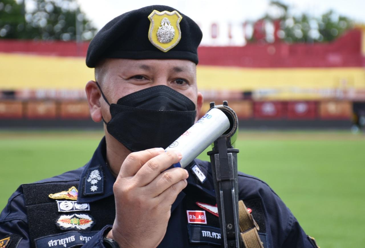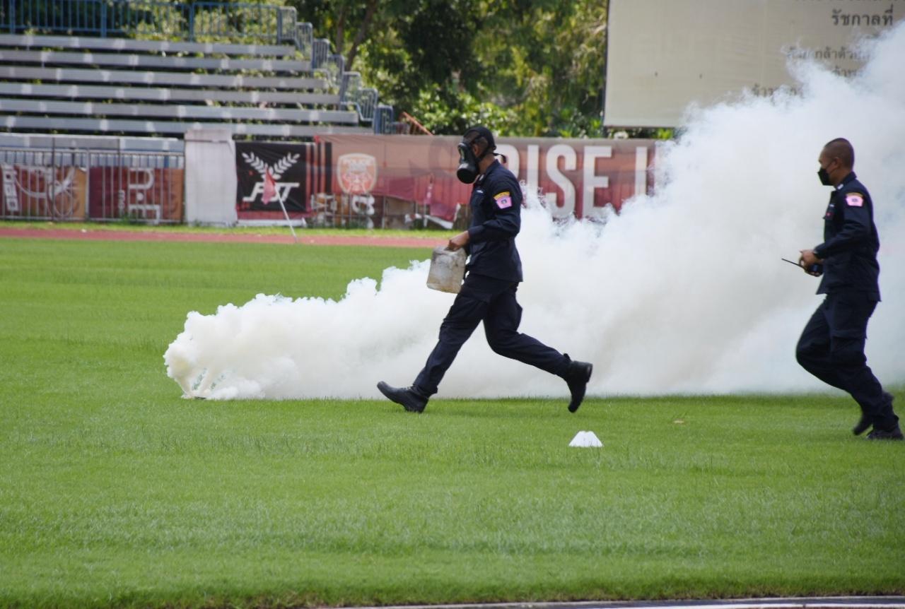 จากนั้น พ.ต.ท.ศรายุทธ อรุณฉาย รอง ผกก.1 บก.อคฝ. ได้ทำการสาธิตวิธียิงแก๊สน้ำตา ICL-830 cartridge with tear gas projectile ขนาด 38 มม. แบบวิถีโค้ง เพื่อควบคุมฝูงชน จำนวน 3 นัด โดยกำหนดจุดตกบริเวณริมสนามฟุตบอล ห่างจากจุดยิงประมาณ 150 เมตร ผลการสาธิตกระสุนแก๊สน้ำตา ตกใกล้เคียงเป้าหมาย เนื่องจากมีผลกระทบจากกระแสลม