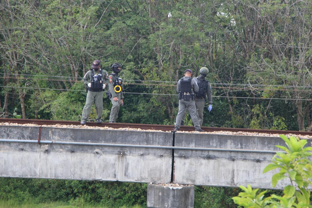 พบจุดเกิดเหตุห่างจากหัวสะพานเหล็ก ประมาณ 20 เมตร โดยมีหลุมระเบิด 2 จุด ห่างกันประมาณ 20 เมตร โดยจุดแรกเป็นบริเวณกลางรางรถไฟ มีร่องรอยก้อนหินคลุกกระเด็นกระจัดจาย เป็นหลุมลึก 1 ฟุต กว้าง 3 ฟุต ซึ่งมีเศษชิ้นส่วนของระเบิดแสวงเครื่องที่คนร้ายประกอบใส่ไว้ในถังแก๊สปิกนิก หนัก 25 กิโลกรัม จุดชนวนด้วยวิทยุสื่อสาร ตกกระจายเกลื่อนทั่วบริเวณ และห่างไปประมาณ 10 เมตร พบหลุมระเบิดจุดที่ 2 บริเวณหมอนคอนกรีตริมไหล่ทางของรางรถไฟ โดยจุดดังกล่าวสะเก็ดระเบิดแสวงเครื่องได้กระเด็นกระจัดกระจายไปยังป่ารกทึบริมไหล่ทาง ซึ่งเจ้าหน้าที่ไม่สามารถบรรจุภาชนะที่คนร้ายประกอบระเบิดได้ ส่วนความเสียหายนั้นมีหมอนคอนกรีตได้รับความเสียหาย จำนวน 10 ต้น ส่วนรางรถไฟไม่ได้รับความเสียหายแต่อย่างใด ส่วนกรณีปลอกกระสุนปืนที่คนร้ายใช้ยิงขบวนรถไฟนั้น เจ้าหน้าที่ไม่สามารถตรวจสอบพบในเบื้องต้น แต่จะมาตรวจสอบหาหลักฐานอย่างละเอียดอีกครั้ง