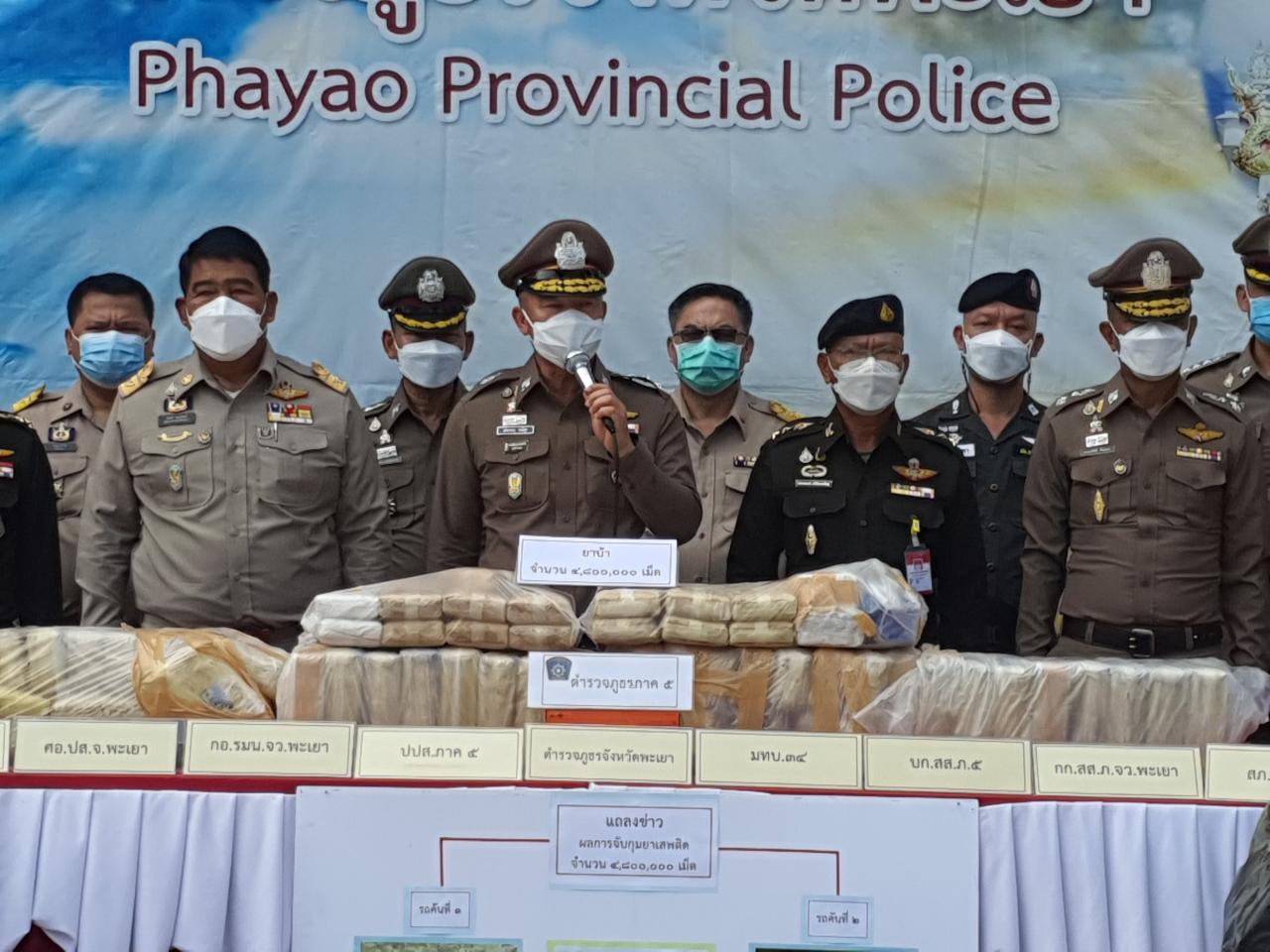 เมื่อวันที่ 30 ส.ค.64 ที่กองบังคับการตำรวจภูธรจังหวัดพะเยา พล.ต.ท.ประจวบ วงศ์สุข ผบช.ภ.5 พล.ต.ต.ธรรมศักดิ์ ปิ่นทอง ผบก.ภ.จว.พะเยา นายโชคดี อมรรัตน์ ผู้ว่าราชการจังหวัดพะเยา พร้อมด้วยเจ้าหน้าที่ที่เกี่ยวข้อง ร่วมแถลงข่าวคดีจับกุมยาเสพติดจำนวน 4,800,000 เม็ด ว่า การจับกุมยาเสพติดในพื้นที่ จ.พะเยา เมื่อเวลาประมาณ 12.00 น. ของวันที่ 29 ส.ค.ที่ผ่านมา ขณะเจ้าหน้าที่ตำรวจ สภ.เชียงม่วน ได้ตั้งด่านตรวจบริเวณด่านตรวจยาเสพติดบ้านปงสนุก อำเภอเชียงม่วน จ.พะเยา