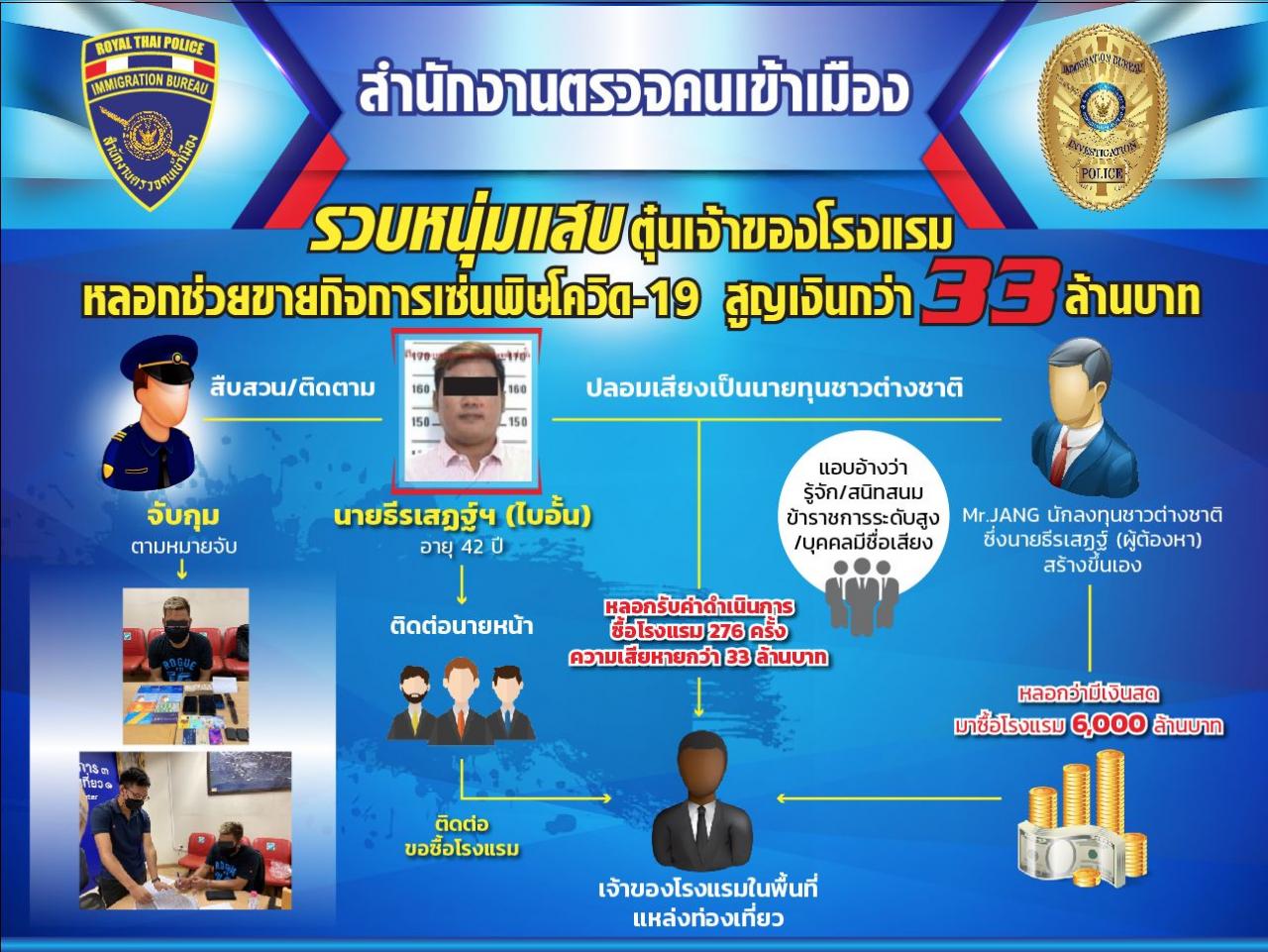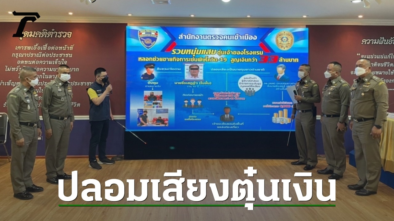 สืบ สตม. แถลงรวบหนุ่มแสบ ตุ๋นเจ้าของโรงแรมดัง หลอกช่วยขายกิจการให้นายทุนชาวสิงคโปร์ และมีบุคคลระดับสูงขอช่วย ที่แท้เป็นผู้ต้องหา รายได้ทั้งหมดที่ใช้การปลอมเสียง ทำให้ต้องสูญเงินเซ่นพิษโควิด-19 กว่า 33 ล้านบาท