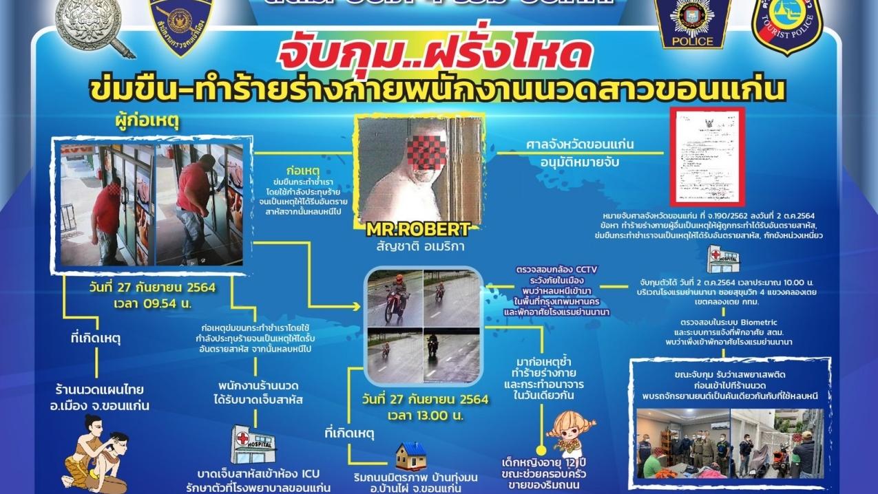 จากการตรวจสอบหลักฐานกล้องวงจรปิด เชื่อมโยงข้อมูลในระบบสารสนเทศของงานตรวจคนเข้าเมือง ทราบว่าผู้ต้องสงสัยคือ นายโรเบิร์ต อายุ 37 ปี สัญชาติอเมริกัน จากข้อมูลการแจ้งที่พักของชาวต่างชาติ และการรายงานตัวทุก 90 วัน ทำให้ทราบว่านายโรเบิร์ต พักอาศัยอยู่ที่โรงแรมแห่งหนึ่ง ย่านซอยนานา ถ.สุขุมวิท กทม. จึงได้ขออนุมัติหมายศาลจังหวัดขอนแก่น ตามหมายจับที่ จ.160/2564 ลง 1 ต.ค.64 เข้าทำการจับกุมตัวผู้ต้องหาได้ตามที่อยู่ข้างต้น ในที่เกิดเหตุพบเสื้อผ้า ทรัพย์สิน และรถจักรยานยนต์ในวันที่ผู้ต้องหาใช้ก่อเหตุ ตั้งข้อหาหนัก คือ "ทำร้ายร่างกายผู้อื่นจนเป็นเหตุให้ผู้ถูกกระทำได้รับอันตรายสาหัส, ข่มขืนกระทำชำเราจนเป็นเหตุให้ได้รับอันตรายสาหัส และหน่วงเหนี่ยวกักขัง" ในชั้นจับกุมผู้ต้องหาให้การรับสารภาพว่าได้กระทำผิดตามที่กล่าวหาจริง เนื่องจากตนได้เสพยาบ้า จนเกิดอารมณ์ เจ้าหน้าที่จึงได้นำตัวส่งพนักงานสอบสวนดำเนินคดีตามกฎหมายต่อไป.
