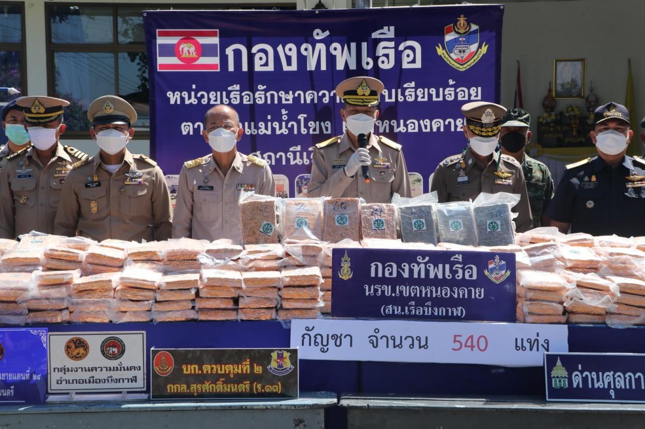 เมื่อเวลา 13.30 น. วันที่ 4 ตุลาคม 2564 ที่สถานีเรือบึงกาฬ (นรข.บึงกาฬ) อ.เมืองบึงกาฬ จ.บึงกาฬ พล.ร.ต.สมบัติ จูถนอม ผบ.นรข., นายธาตรี บุญมาก รอง ผวจ.บึงกาฬ, พล.ต.ต.ธรรมจักร คงมงคล ผบก.ภ.จว.บึงกาฬ และ น.อ.ราฆพ เทวะประทีป ผบ.นรข.เขตหนองคาย พร้อมหน่วยงานที่เกี่ยวข้องร่วมกันแถลงข่าวผลการตรวจยึดกัญชาแห้งอัดแท่งจำนวน 540 แท่ง น้ำหนักประมาณ 540 กิโลกรัม หุ้มฟอยล์สีทองแดง เกรดพรีเมียม ติดโลโก้รูปใบกัญชาในวงกลมสีเขียว พร้อมตัวหนังสือภาษาอังกฤษ MADE IN LAO และสัญลักษณ์รูปธงชาติลาว มูลค่ากว่า 16 ล้านบาท