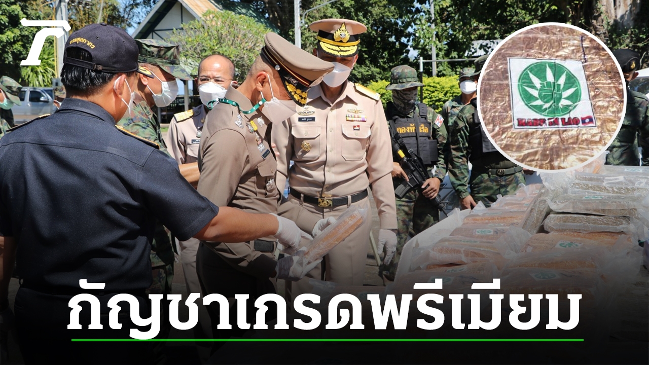 นรข.บึงกาฬ พร้อมด้วยหน่วยงานที่เกี่ยวข้องแถลงผลการตรวจยึดกัญชาแท่งเกรดพรีเมียม 540 กิโลกรัม มูลค่ากว่า 16 ล้านบาท ติดโลโก้ใบกัญชา ระบุข้อความ MADE IN LAO