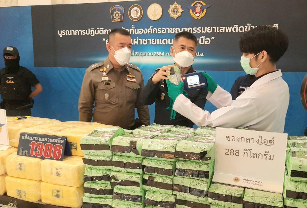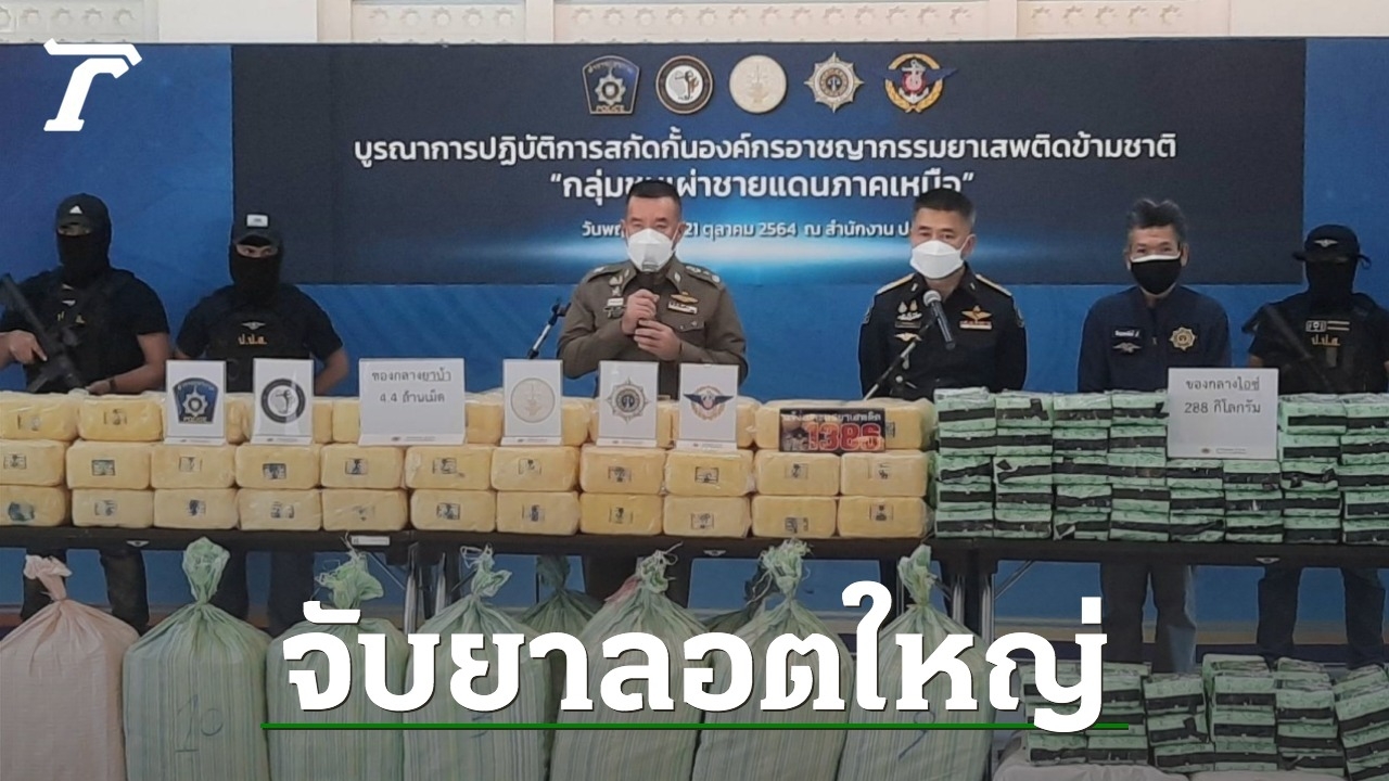 เมื่อเวลา 13.00 น. วันที่ 21 ต.ค. 64 ที่สำนักงาน ป.ป.ส. ดินแดง นายวิชัย ไชยมงคล เลขาธิการ ป.ป.ส. พล.ต.ท.ปิยะ ต๊ะวิชัย ผบช.ภ.5 แถลงข่าวจับกุม นายกิตติธร แสนท้าว อายุ 24 ปี และนายกานต์ ธนาวงศ์ไพศาล อายุ 24 ปี ทั้งสองเป็นชาวม้ง พร้อมของกลาง ไอซ์ 288 กิโลกรัม ยาบ้า 4.4 ล้านเม็ด รถกระบะ ยี่ห้อ อิซูซุ ดีแม็กซ์ สีเทา ทะเบียน ผต 3908 นครปฐม ลักษณะต่อตู้ทึบด้านหลัง (ใส่ยาเสพติดของกลาง) และรถกระบะยี่ห้อ โตโยต้า รีโว่ สีดำ ทะเบียน 2 ฒง 2348 กรุงเทพมหานคร พร้อมตรวจยึดทรัพย์สินเป็นเงินสด จำนวน 1.1 แสนบาท และทองรูปพรรณ 2 รายการ