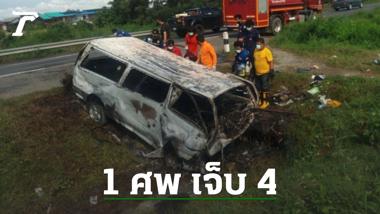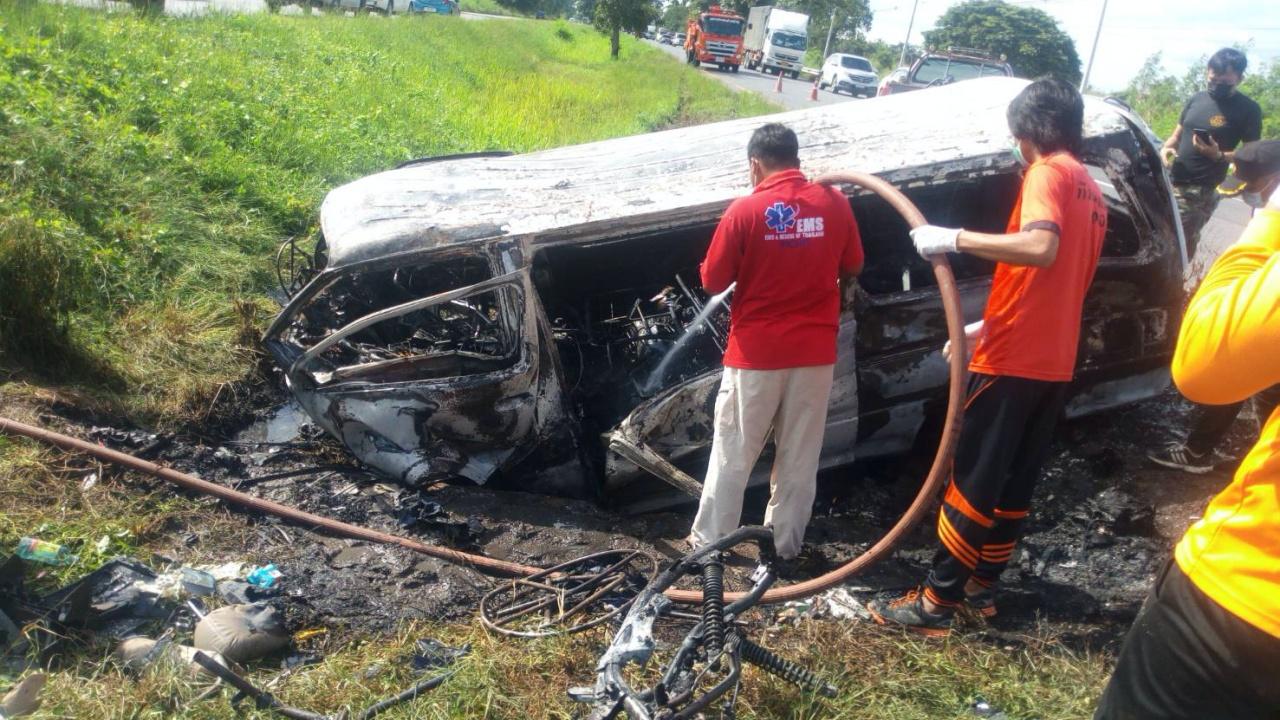 รถตู้จากทม.มุ่งหน้าเชียงรายเกิดอุบัติเหตุพ่งชนแท่งปูนท่อระบายน้ำเกาะกลางถนนที่พิจิตร เกิดไฟลูกไหม้วอดทั้งคัน มีผ้เสียชีวิต 1 ศพบาดเจ็บ 4 คาดคนขับวัย 61 ปีน่าจะหลับใน