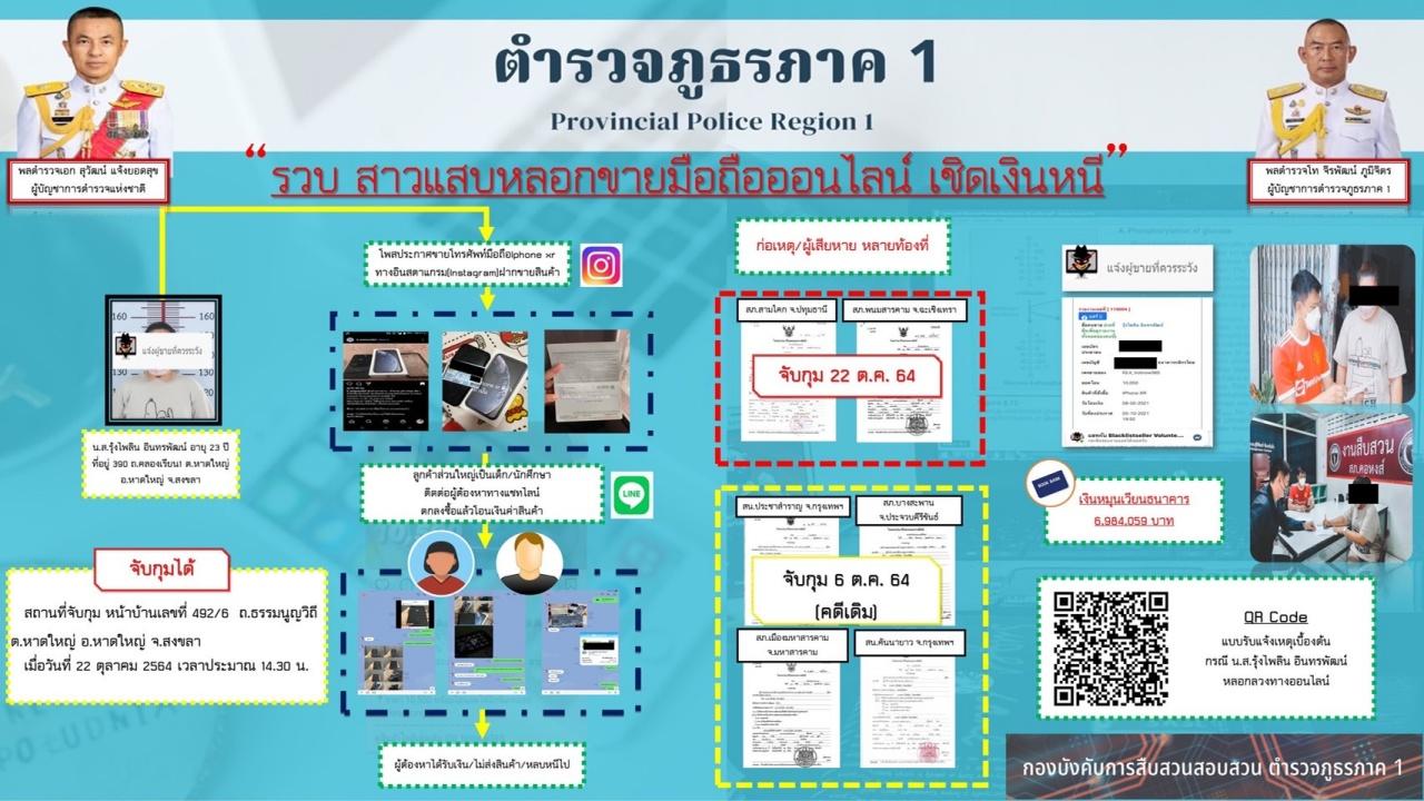 "บิ๊กอุ้ย-จิรพัฒน์ ภูมิจิตร" ผบช.ภ.1 นำทีมสืบสวนภาค 1 พร้อมด้วย ชุดสืบสวน สภ.สามโคก แถลงรวบสาวแสบหลอกขายโทรศัพท์มือถือ ไอโฟน ผ่านไอจี มีผู้หลงเชื่อยอมโอนเงินมากกว่า 100 คน อึ้งเงินหมุนเวียนในบัญชีธนาคารเกือบ 7 ล้านบาท