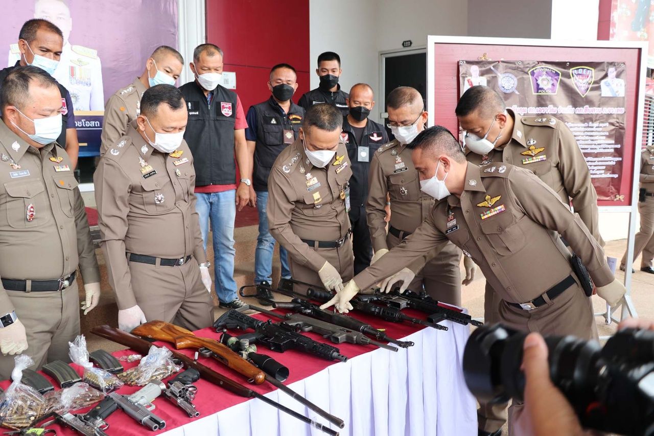 เวลา 10.00 น. วันที่ 28 ตุลาคม พล.ต.ท.ยรรยง เวชโอสถ ผู้บัญชาการตำรวจภูธรภาค 4 พร้อมด้วยเจ้าหน้าที่ตำรวจสืบสวนสอบสวน ตำรวจภูธรภาค 4 และชุดจำกุม สภ.เอราวัณ จ.เลย ร่วมแถลงการจับกุนนายเอกชัย ตั้งสมบูรณ์ อายุ 37 ปี หรือ ช.กอล์ฟ เอราวัณ อยู่บ้านเลขที่ 804 หมู่ที่ 7 ตำบลผาอินทร์แปลง อ.ผาขาว จ.เลย พร้อมของกลางอาวุธปืนสงคราม อาวุธปืนเล็กยาว (เอ็ม 16) จำนวน 1 กระบอก, อาวุธปืนเล็กยาวอาก้า (เอเค 47) จำนวน 2 กระบอก, อาวุธปืนกลมือ ขนาด 9 มม. (อูซี่) จำนวน 1 กระบอก, อาวุธปืนกลมือ ขนาด 11 มม. จำนวน 1 กระบอก, อาวุธปืนยาว (ลูกกรด) ขนาด .22 มม. 1 กระบอก, อาวุธปืนยาวไทยประดิษฐ์ (ลูกกรด) ขนาด .22 มม. จำนวน 1 กระบอก, อาวุธปืนพกสั้น ขนาด .357 มม. รูเกอร์ จำนวน 1 กระบอก, อาวุธปืนพกสั้น ขนาด .40 มม. จำนวน 1 กระบอก, อาวุธปืนพกสั้น ขนาด .45 มม. 1 กระบอก, อาวุธปืนพกสั้น (ไทยประดิษฐ์) ขนาด .38 มม. จำนวน 1 กระบอก, กระสุนปืนขนาด .22 แม็กนัม จำนวน 9 นัด, กระสุนปืนขนาด .45 จำนวน 55 นัด, กระสุนปืนขนาด 9 มม. จำนวน 50 นัด, กระสุนปืนอาก้า ขนาด 7.62 มม. จำนวน 40 นัด, กระสุนปืนเอ็ม 16 ขนาด 5.56 มม. กระสุน จำนวน 103 นัด, กระสุนปืนเอ็ม 16 ขนาด 5.56 มม., กระสุนซ้อม จำนวน 15 นัด, กระสุนปืนขนาด .40 จำนวน 43 นัด, กระสุนปืนขนาด .357 จำนวน 11 นัด, ลำกล้องลดเสียง (สแตนเลส) จำนวน 1 ชิ้น, ลำกล้องลดเสียง (สีดำ) จำนวน 1 ชิ้น และยาบ้า 181 เม็ด ยาไอซ์ 4.18 กรัม