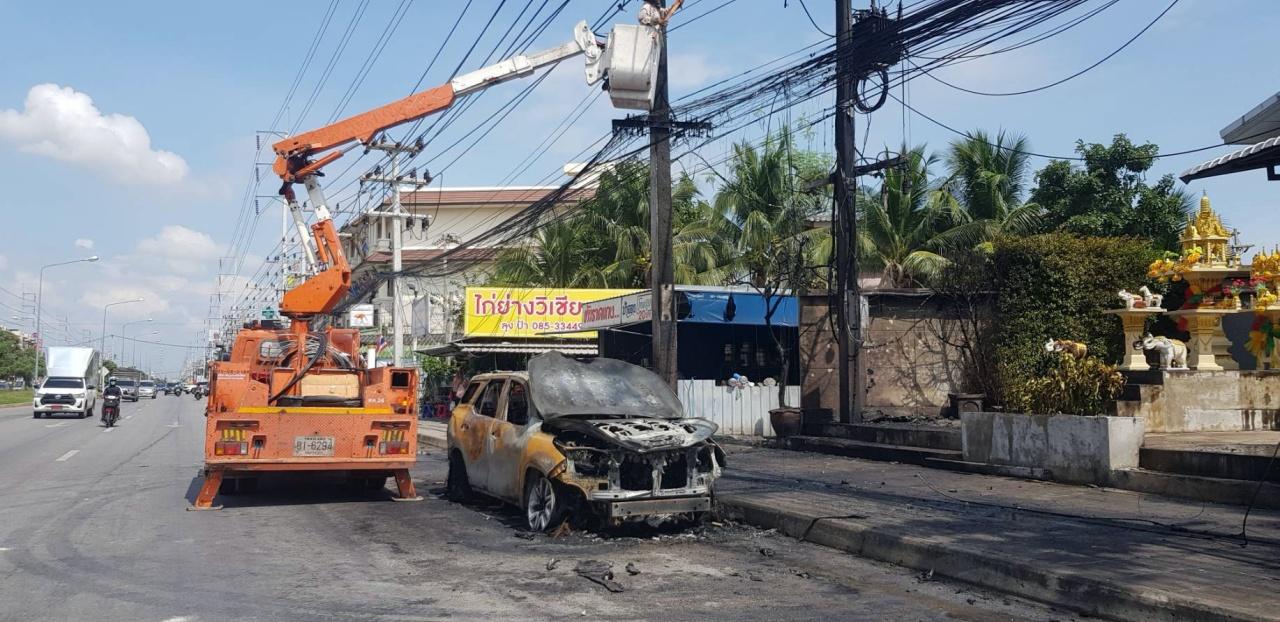 เกิดเหตุหม้อแปลงไฟฟ้าระเบิด 2 ครั้ง ริมถนนในเมืองมหาชัย จนท.ไฟฟ้ามาเปลี่ยนแต่ระเบิดซ้ำอีก มีรถยนต์ฟอร์จูนเนอร์จอดอยู่ เจ้าของยังไม่รู้เป็นใคร โดนเปลวไฟตกใส่รถไหม้วอดทั้งคัน ตำรวจเรียกสอบ หากเป็นความประมาทของ จนท. การไฟฟ้าต้องรับผิดชอบชดใช้